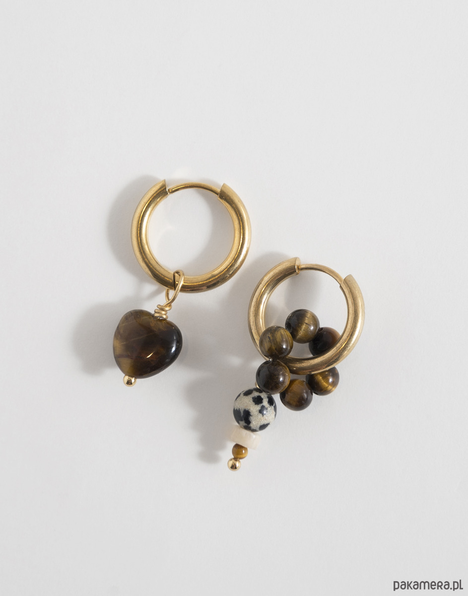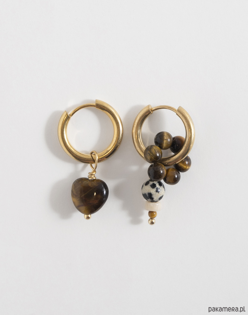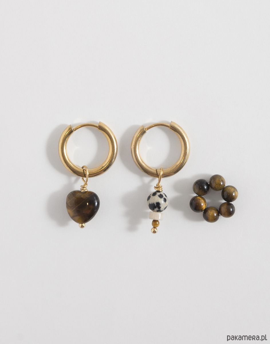 Kolczyki wykonano ze złotej stali chirurgicznej. Zestaw zawiera trzy wymienne zawieszki: kwiatka i serce z tygrysiego oka oraz zawieszkę z jaspisu dalmatyńskiego, howlitu i tygrysiego oka. Zawieszki można nosić razem, pojedynczo lub całkowicie je odpiąć, pozostawiając same kolczyki.