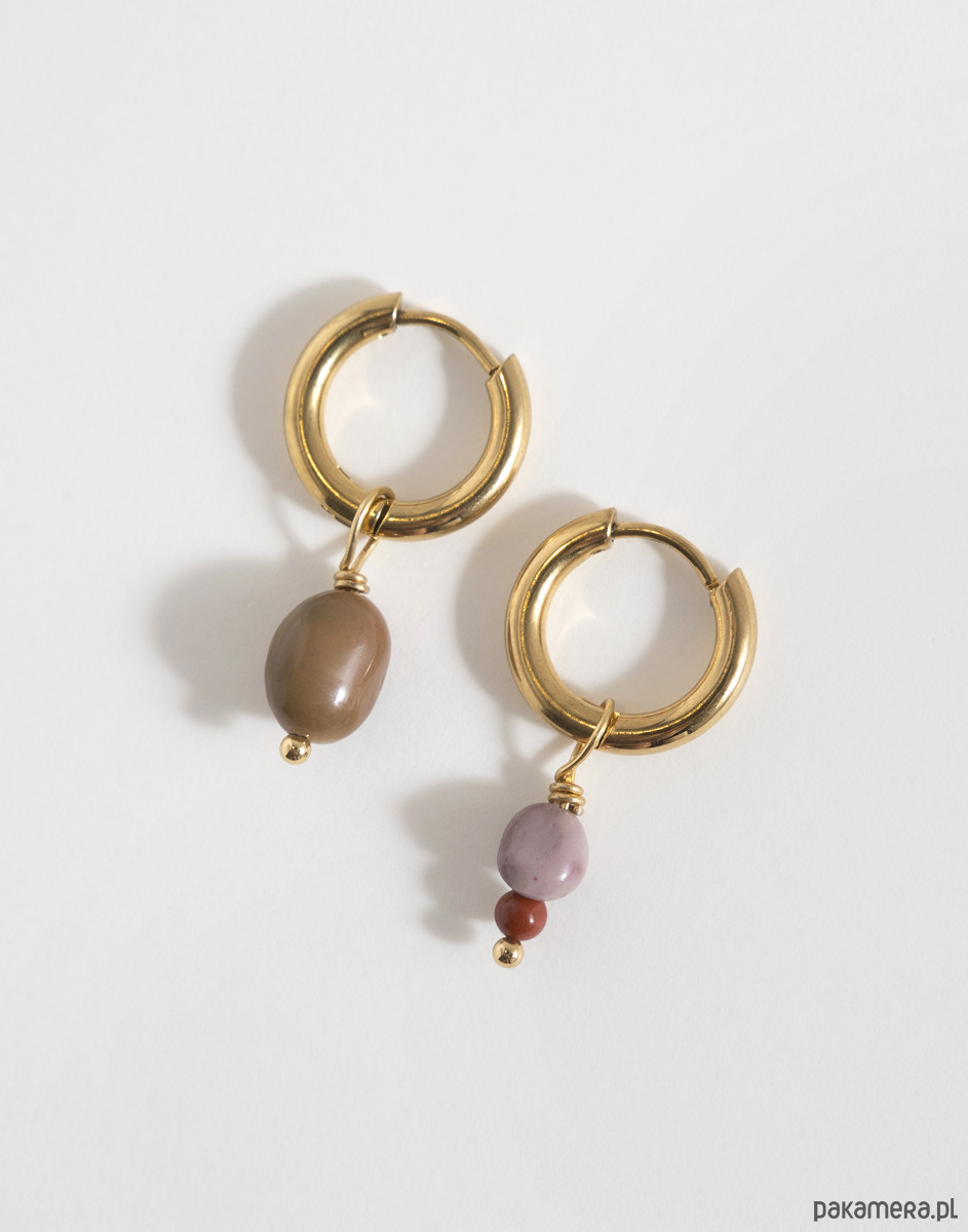 Kolczyki w kształcie kół wykonano ze złotej stali chirurgicznej. Zdobione są zawieszkami z kamienia naturalnego - jaspisu mokaitu.