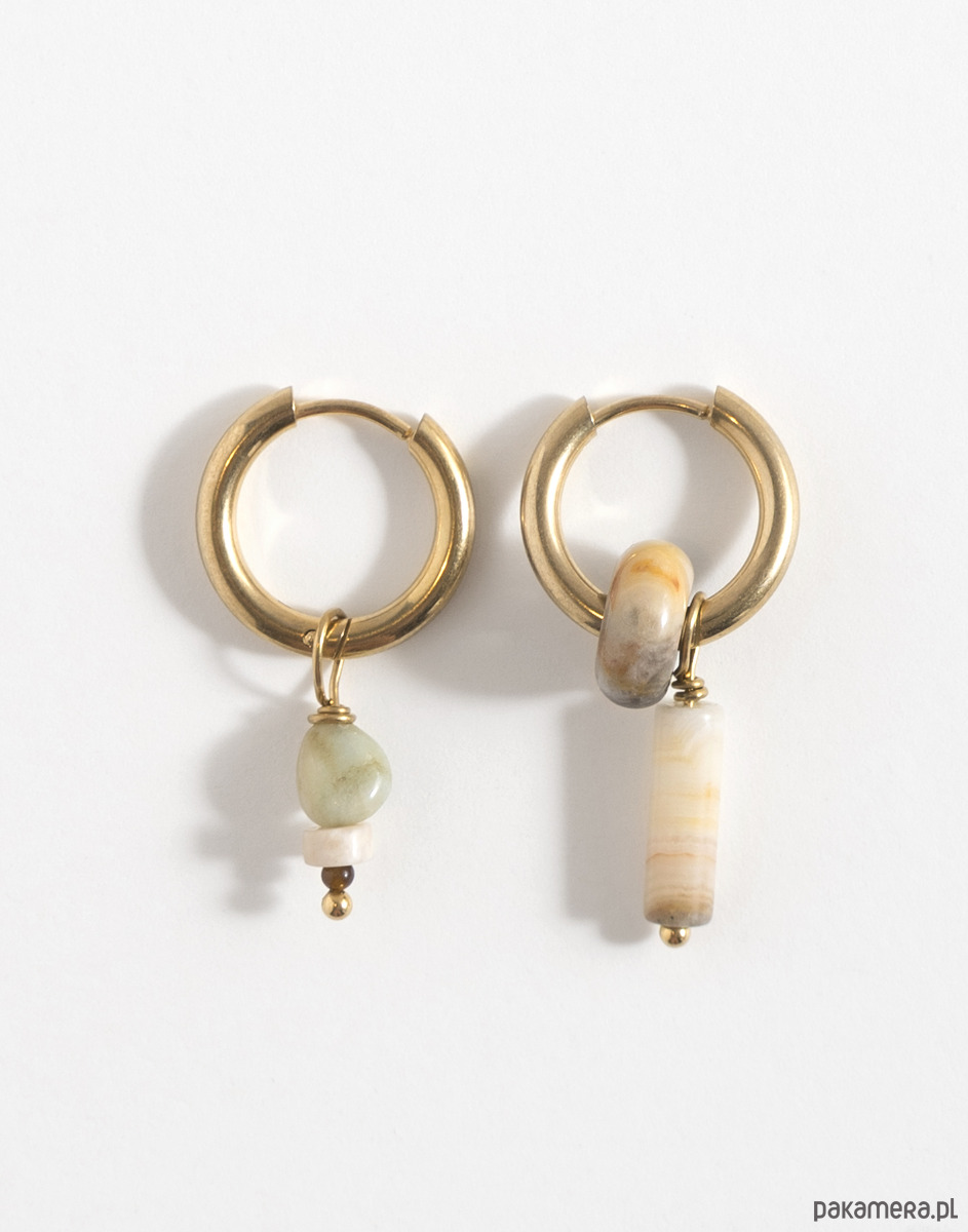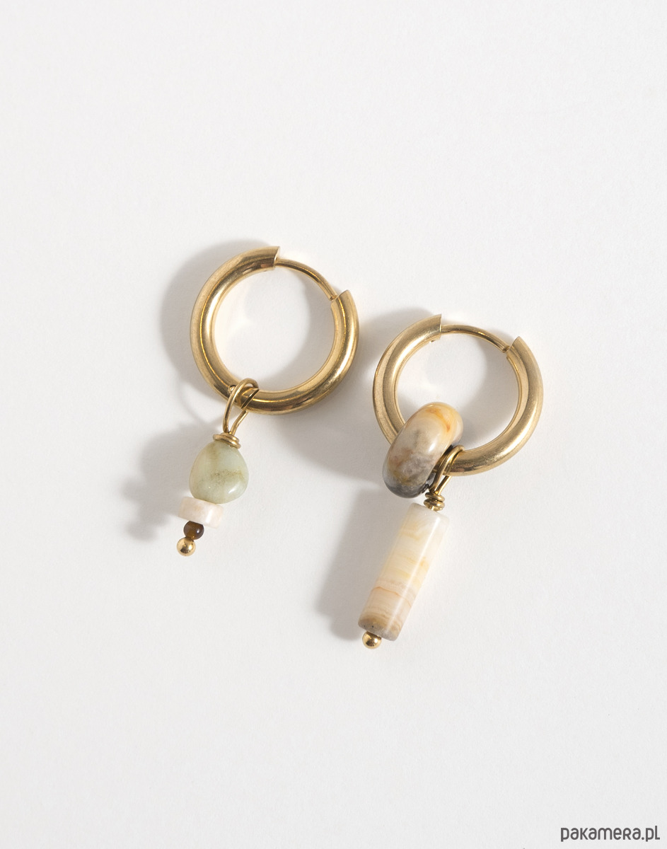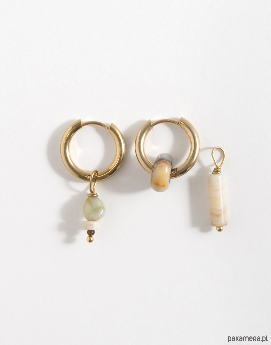 Kolczyki wykonano ze złotej stali chirurgicznej. Zestaw zawiera trzy wymienne zawieszki: oponkę z agatu oraz zawieszki z amazonitu, tygrysiego oka i howlitu. Zawieszki można nosić razem, pojedynczo lub całkowicie je odpiąć, pozostawiając same kolczyki.