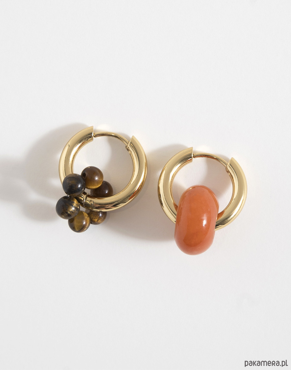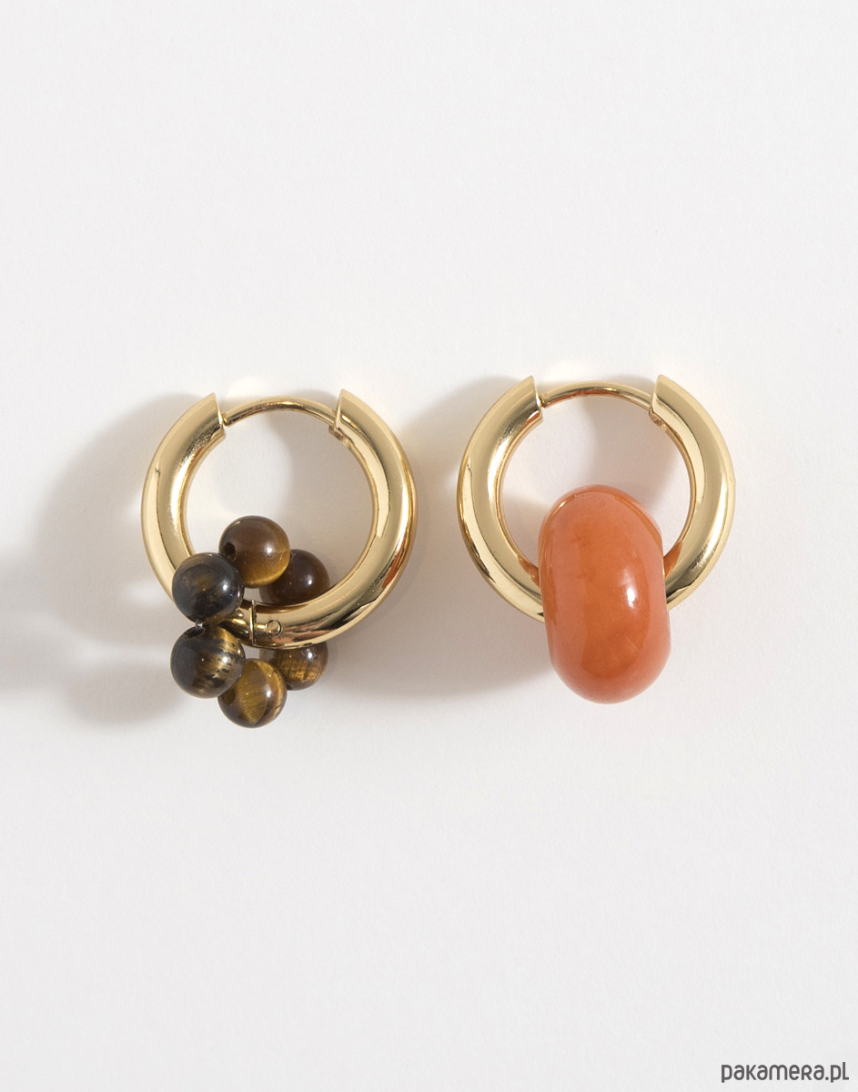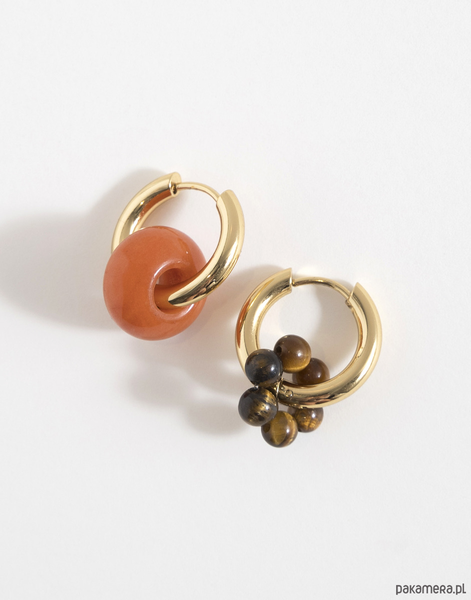 Kolczyki wykonano ze złotej stali chirurgicznej. Zdobione są zawieszkami z naturalnych kamieni – oponką z jadeitu oraz kwiatkiem z tygrysiego oka.