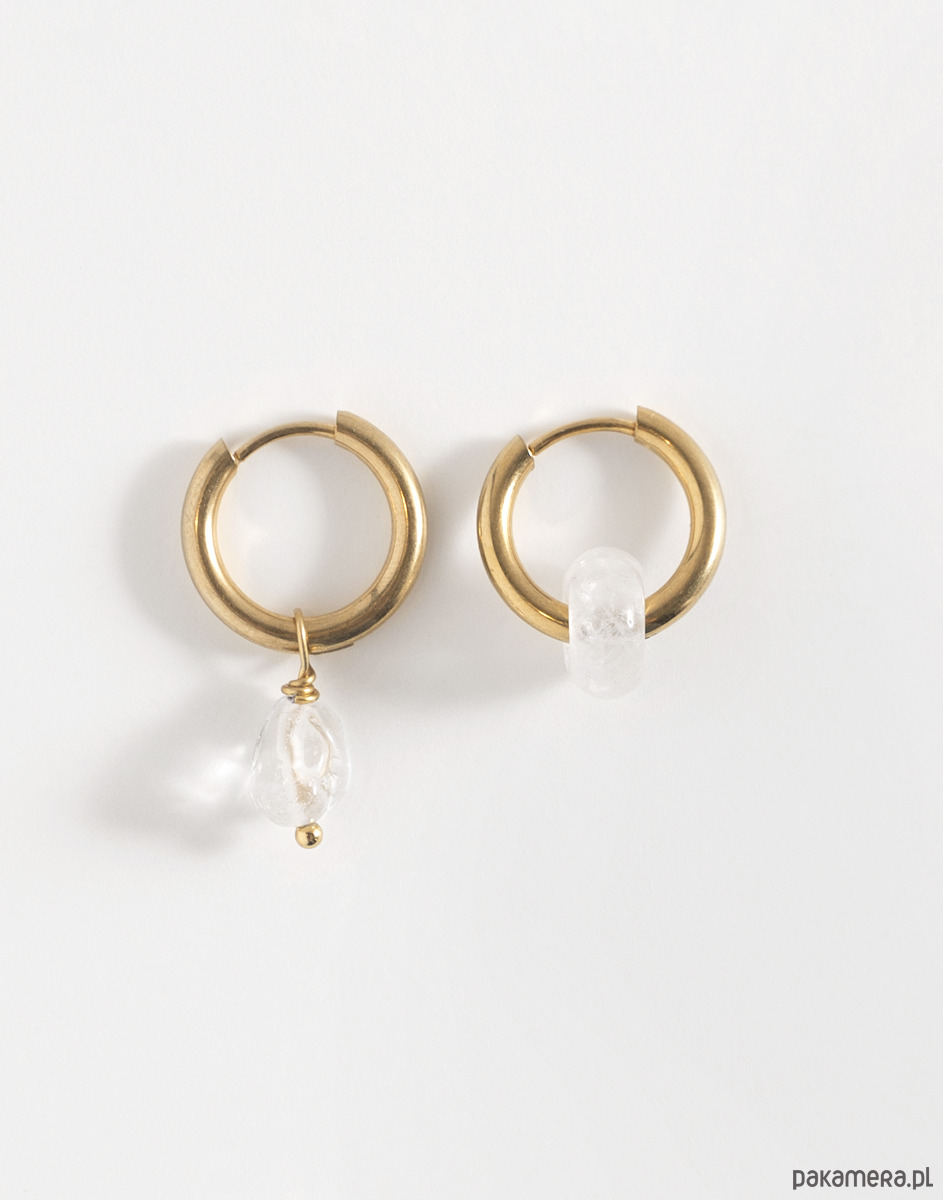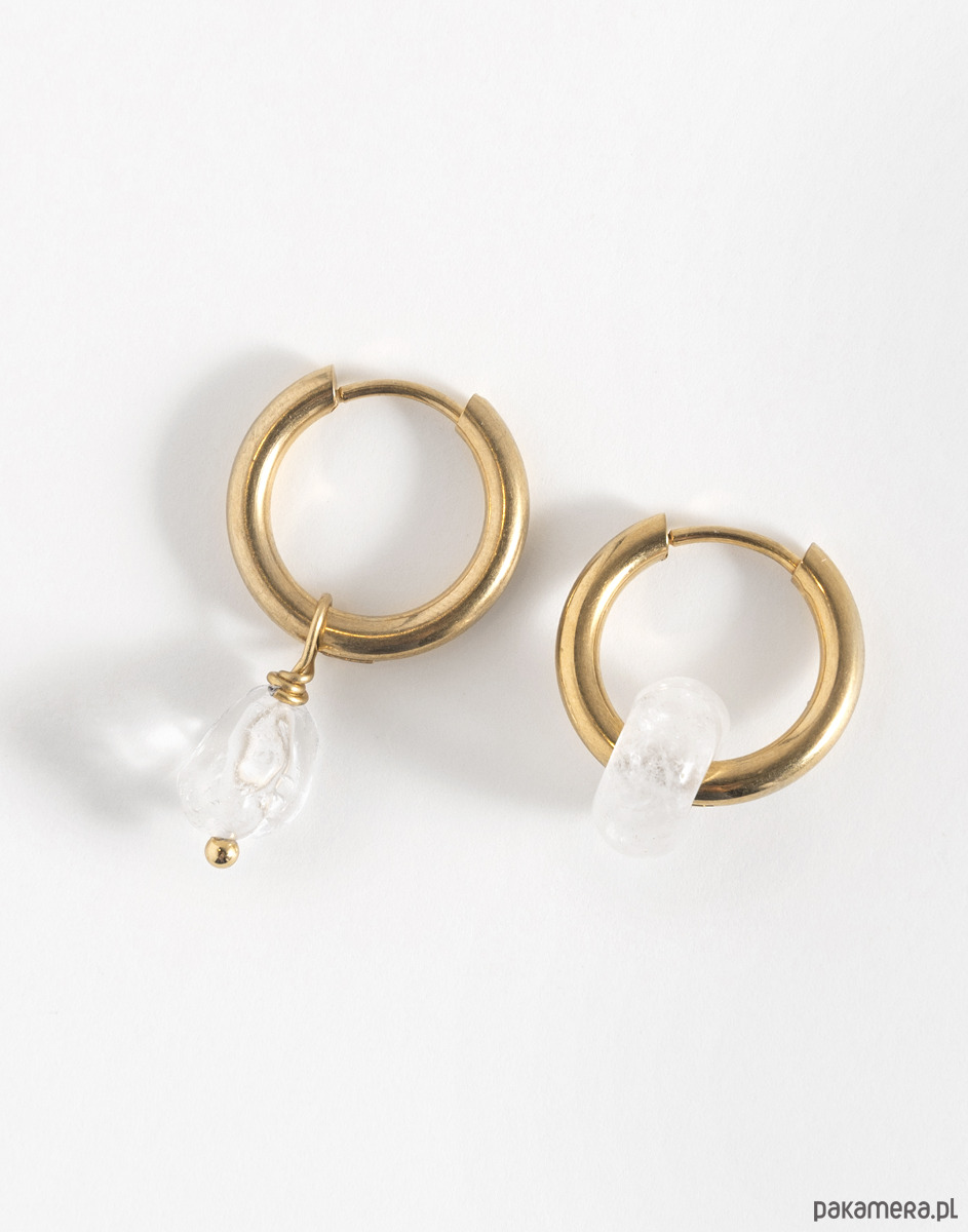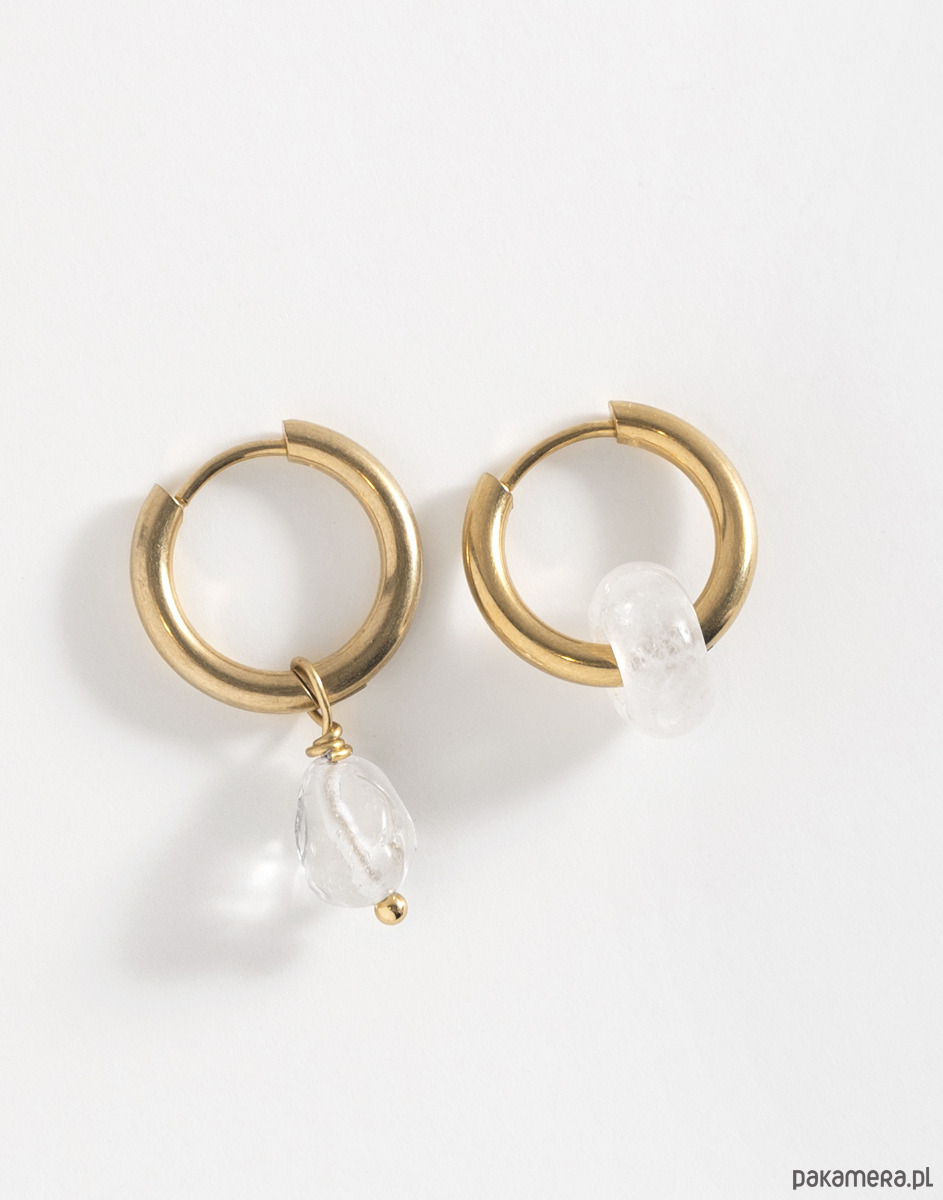 Kolczyki wykonano ze złotej stali chirurgicznej. Zawieszka oraz oponka zostały wykonane z kryształu górskiego.