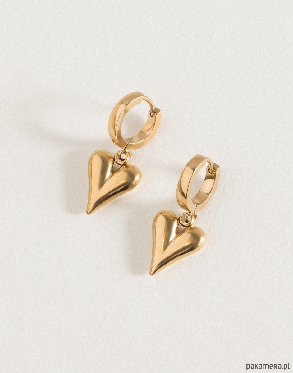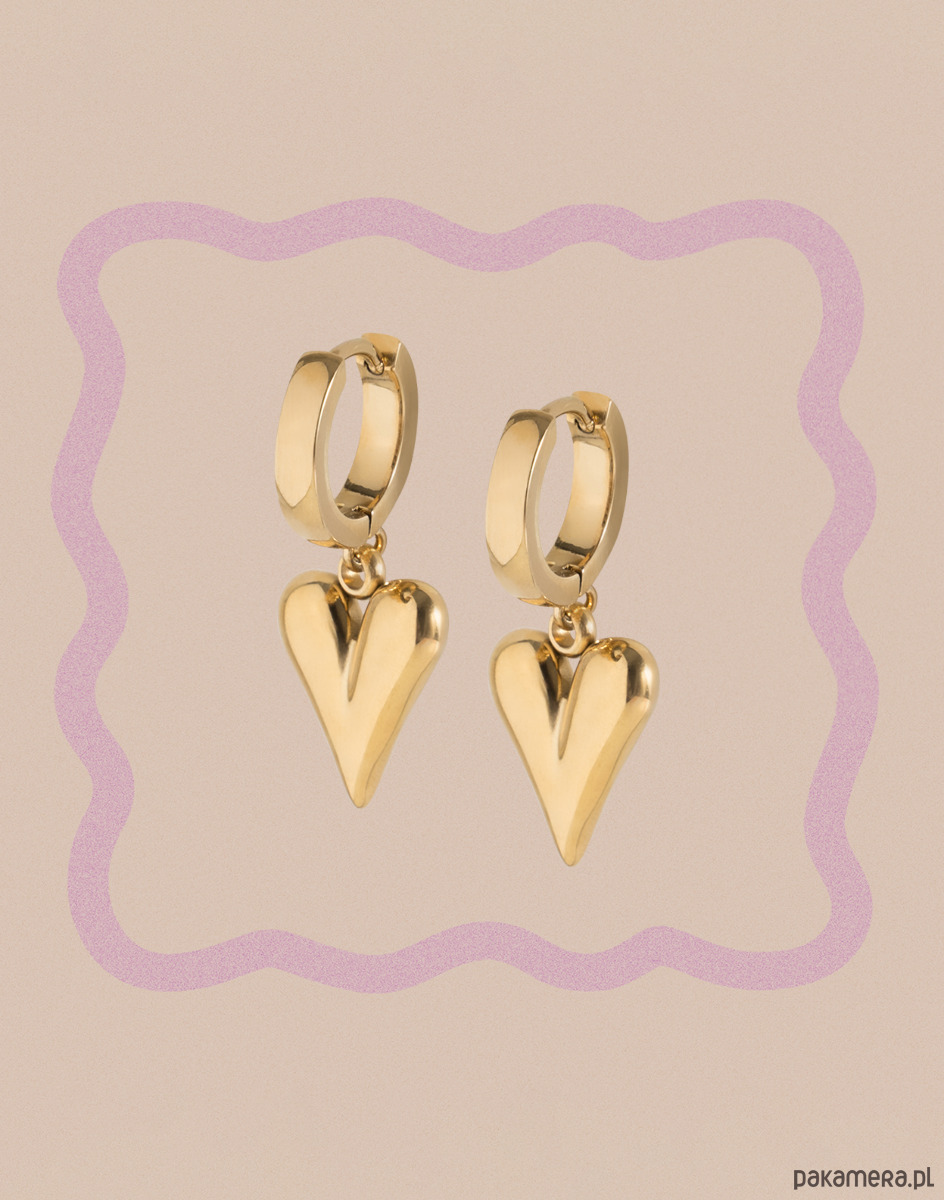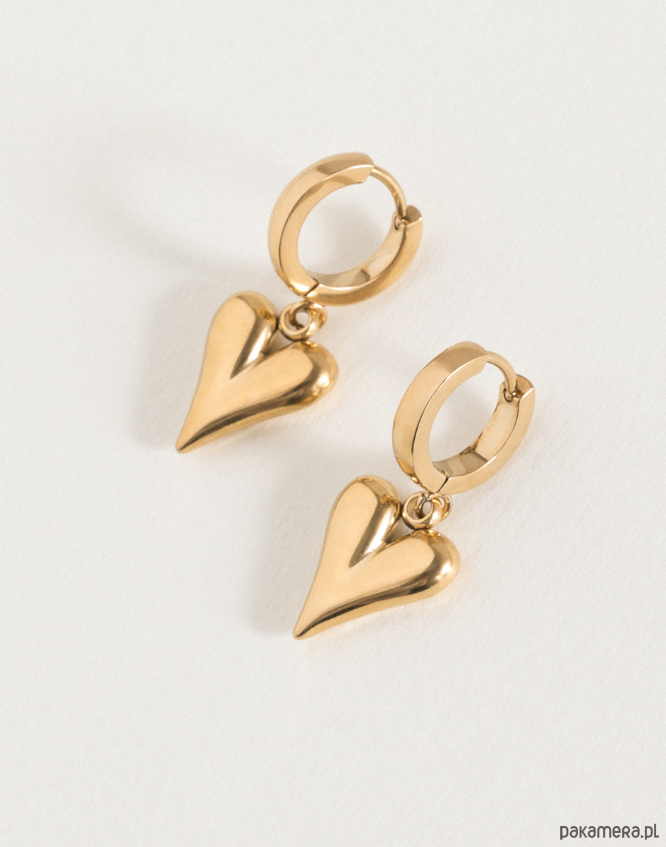 Kolczyki w kształcie kół, ozdobione zawieszkami w kształcie serca, zostały wykonane ze złotej stali chirurgicznej.