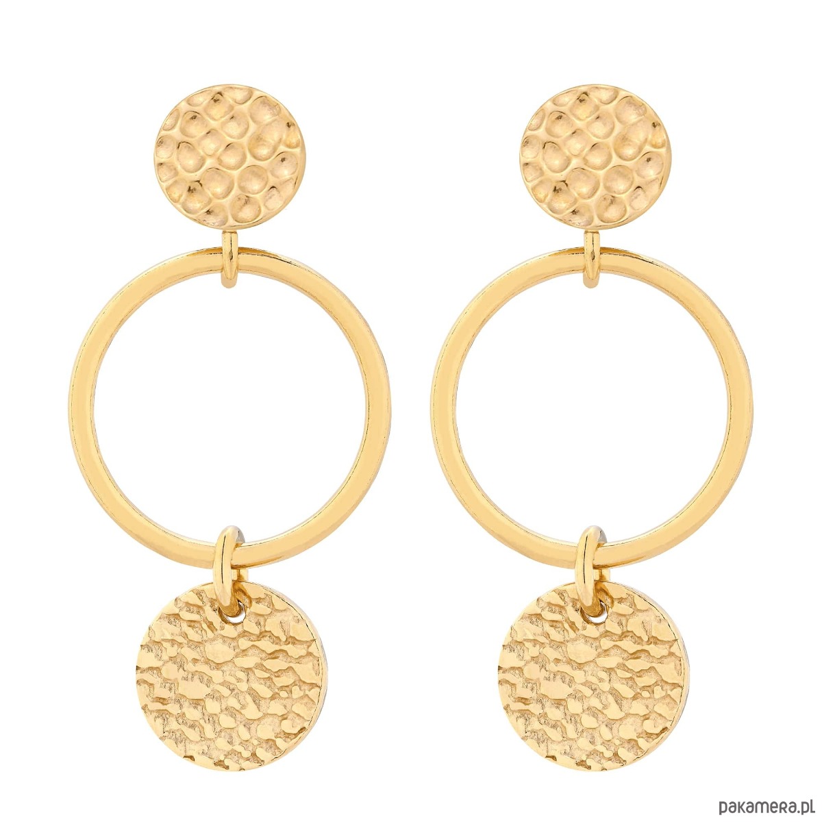 Złote długie kolczyki z obręczami i chropowatymi kółeczkami. Zapinane na sztyft. Kolczyki posiadają zapięcia (baranki). Całość wykonana ze srebra 925 powlekanego 24 karatowym żółtym złotem.
