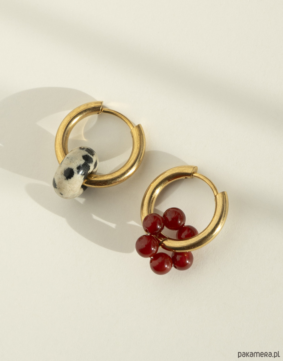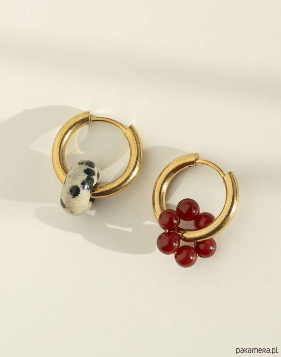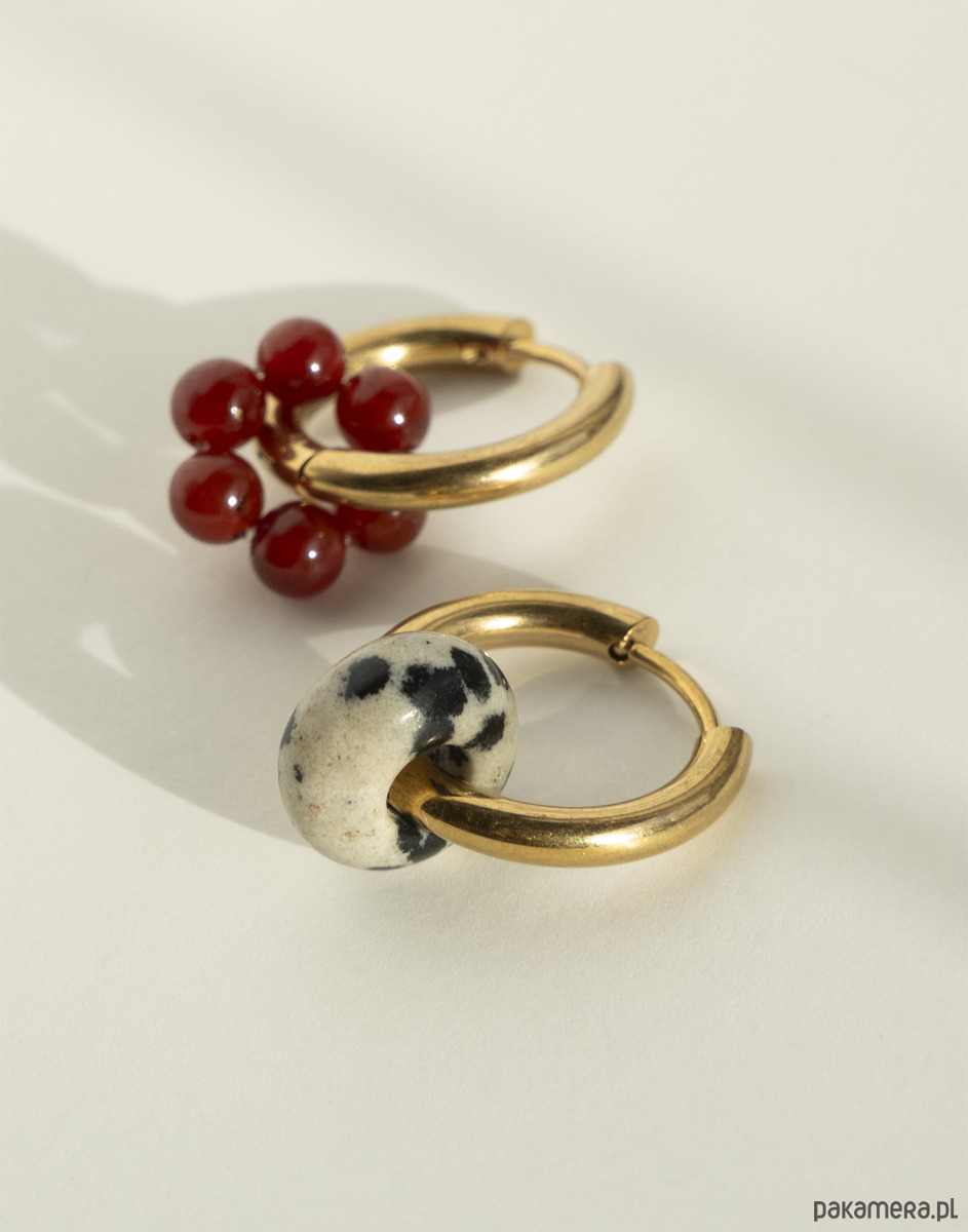 Kolczyki wykonano ze złotej stali chirurgicznej, z zawieszką w kształcie oponki z jaspisu dalmatyńskiego oraz kwiatka z agatu.