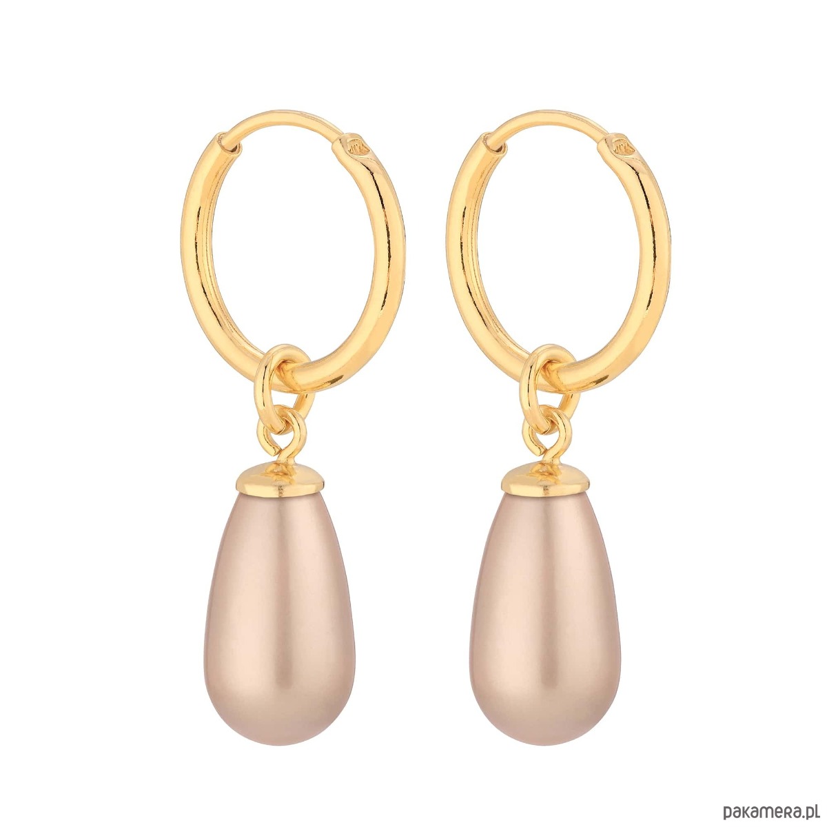 Złote kolczyki koła z perłą SWAROVSKI® CRYSTAL w kolorze pudrowym Powder Almond. Całość wykonana ze srebra 925 powlekanego 24 karatowym żółtym złotem.