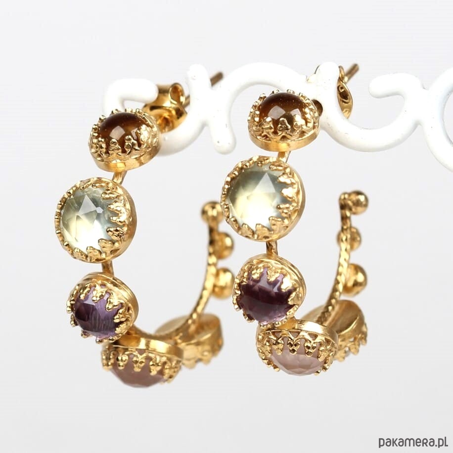 DREAM - Ręcznie wykonane kolczyki kółka ze srebra pokrytego 24-karatowym złotem z cytrynem, prehnitem, ametystem, kwarcem różowym i kryształem górskim