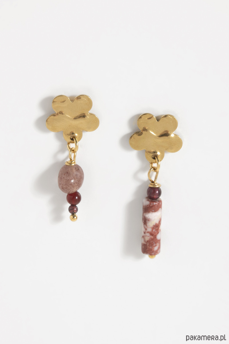 Kolczyki w kształcie kwiatków wykonano ze złotej stali chirurgicznej, a ich zawieszki zdobią naturalne kamienie: kwarc truskawkowy, jaspis cesarski i granat.