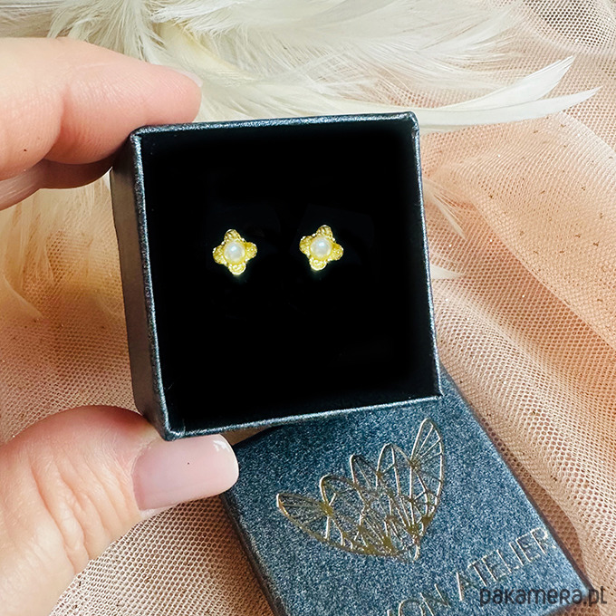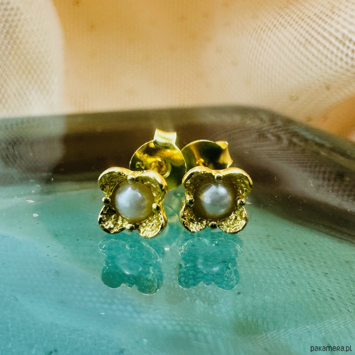 Złote kolczyki kwiatki z perełką, mini sztyfty perła, komunia