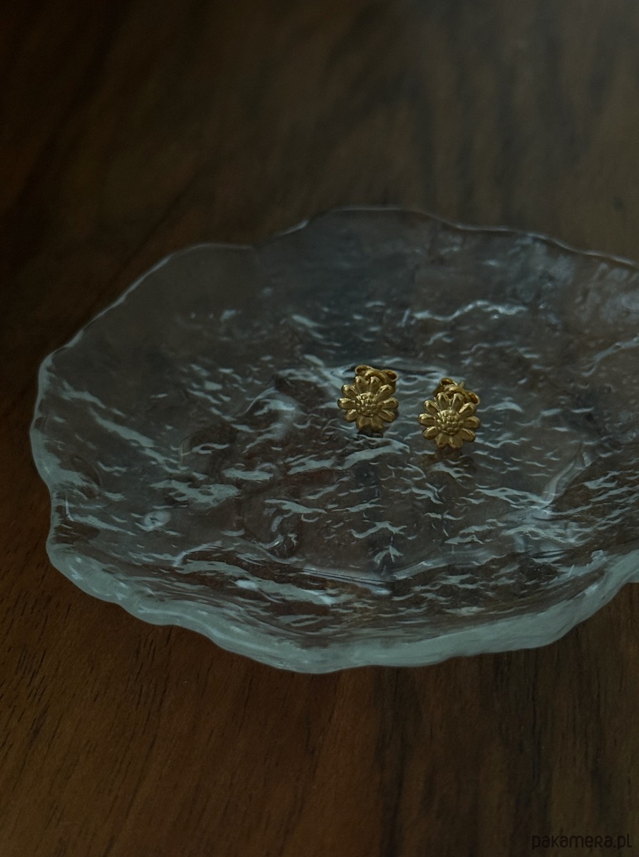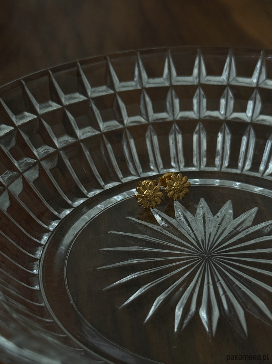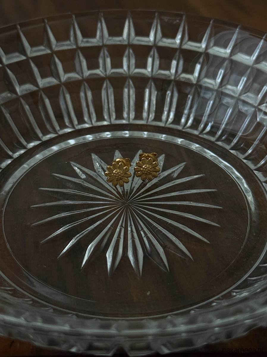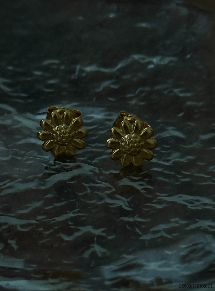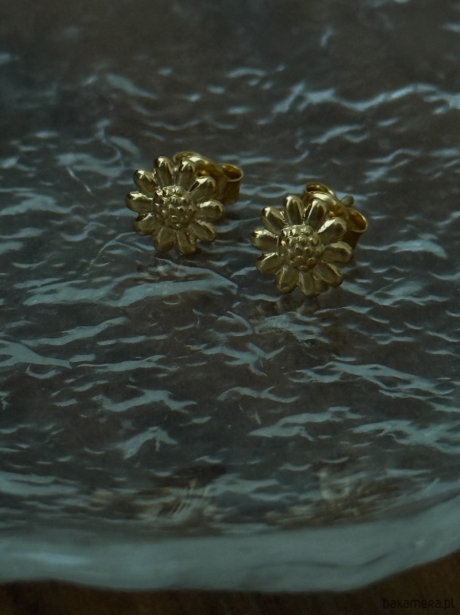 Złote kolczyki kwiatuszki. Całość wykonana ze srebra 925 powlekanego 24 karatowym żółtym złotem. Zapinane na sztyft. Kolczyki posiadają zapięcia (baranki).