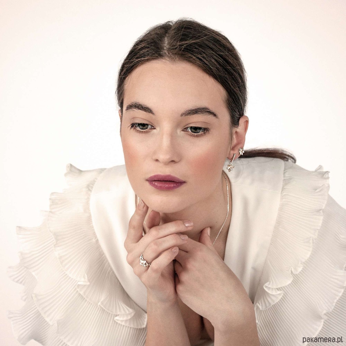 Kolekcja KWIATY POLNE umiejętnie łączy styl romantyczny z nowoczesnym. Inspiracją do jej powstania stały się kwiaty białej przylaszczki. Niepozorne kwiaty o charakterystycznie wygiętych płatkach posłużyły do stworzenia głównego motywu. Z czułością ręcznie wyrzeźbione detale subtelnie odbijają światło, sprawiając, że ich faktura mieni się żywo. Cyrkonia otulona pręcikami skupia na sobie uwagę, a przy przygaszonym, wieczornym świetle gra pierwsze skrzypce. Całość cechuje wysoka precyzja wykonania.