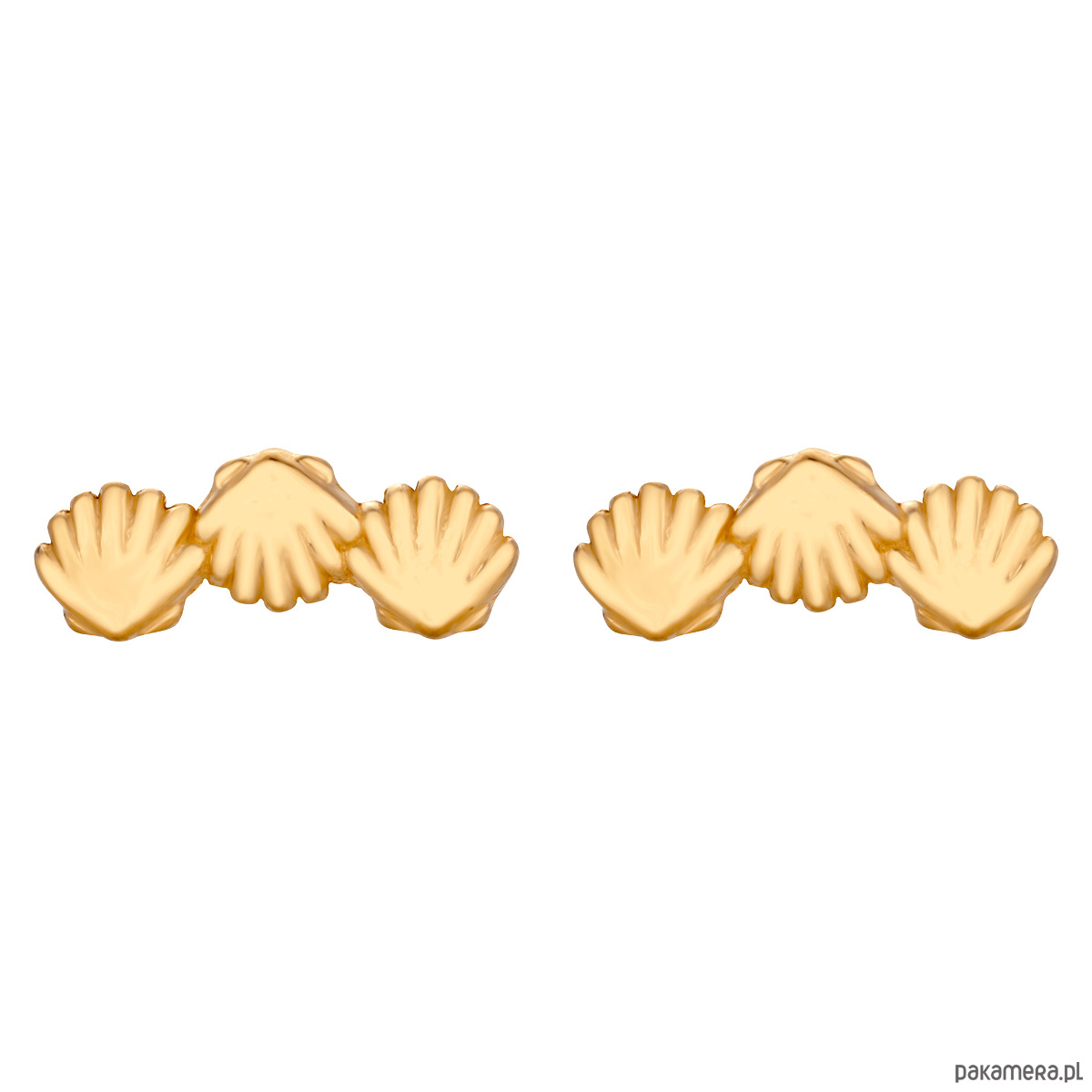 Złote kolczyki muszelki. Całość wykonana ze srebra 925 powlekanego 24 karatowym żółtym złotem. Zapinane na sztyft. Kolczyki posiadają zapięcia (baranki).