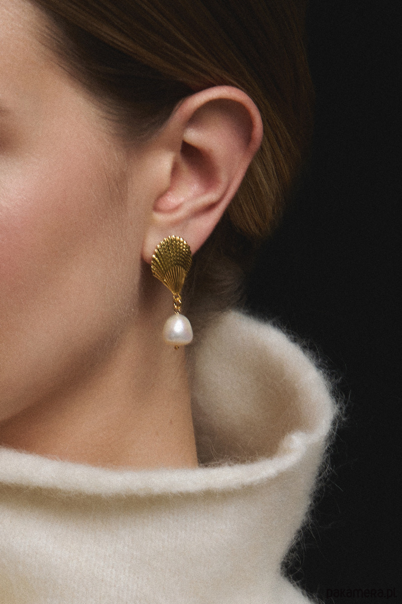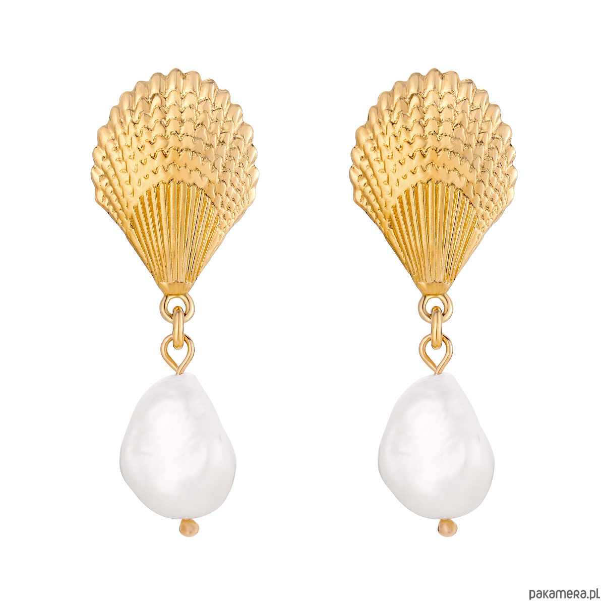 Złote kolczyki wykonane z muszli i naturalnych pereł słodkowodnych. Całość wykonana ze srebra 925 powlekanego 24 karatowym żółtym złotem. Zapinane na sztyfty.