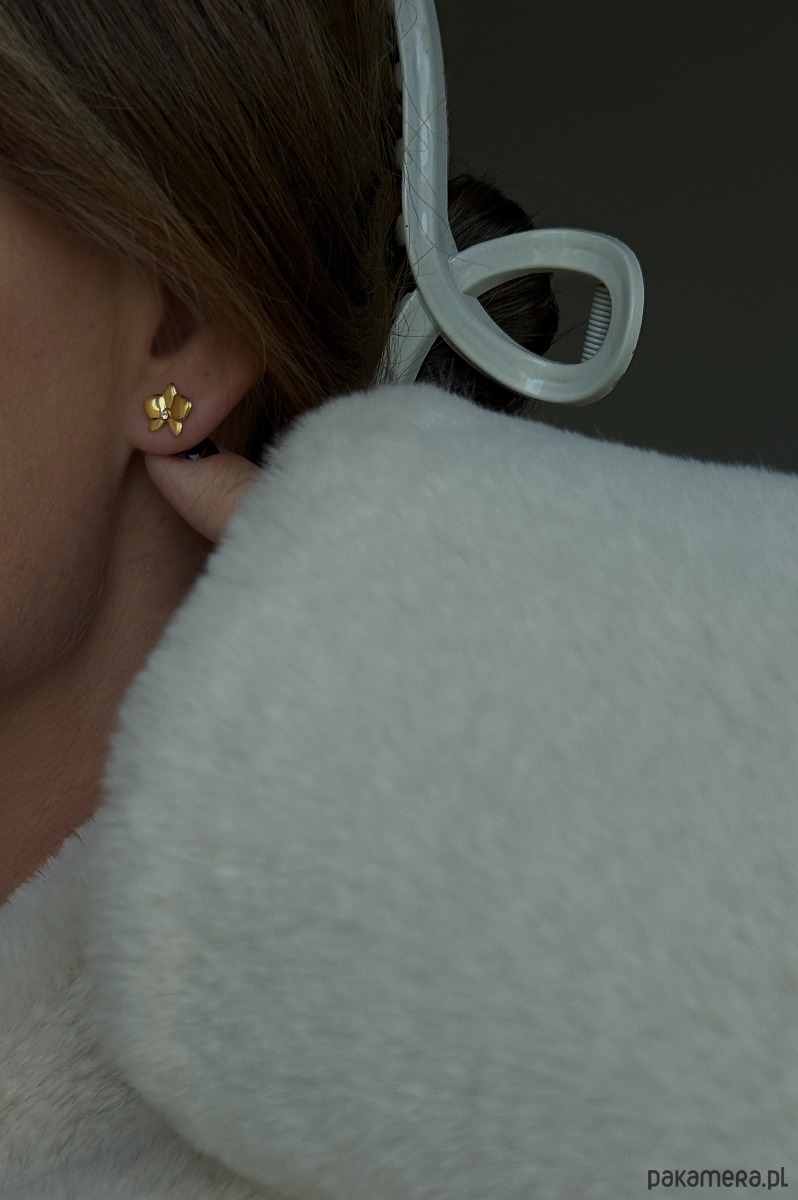 Złote kolczyki orchidee z bezbarwnymi kryształkami Preciosa. Całość wykonana ze srebra 925 powlekanego 24 karatowym żółtym złotem. Zapinane na sztyft. Kolczyki posiadają zapięcia (baranki).