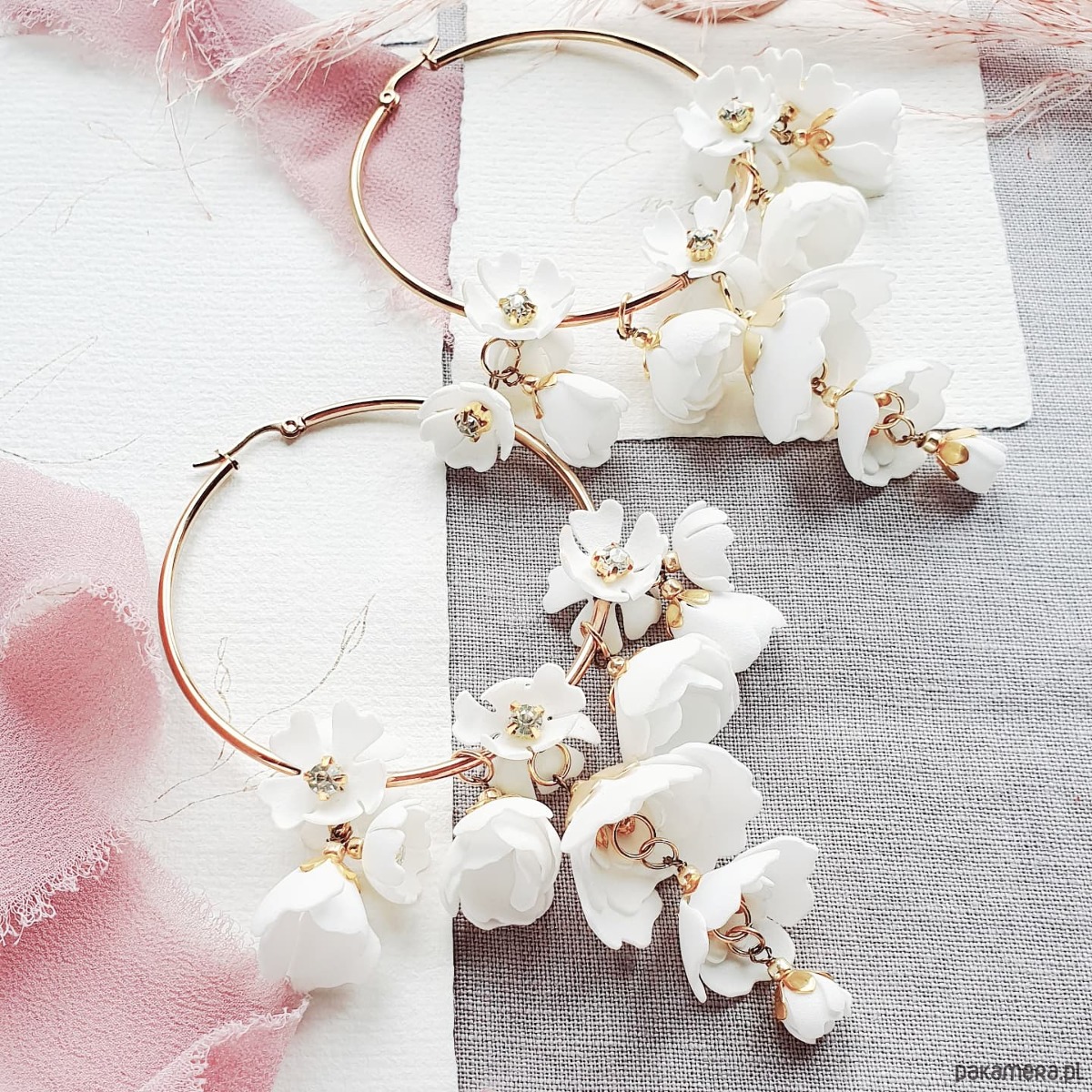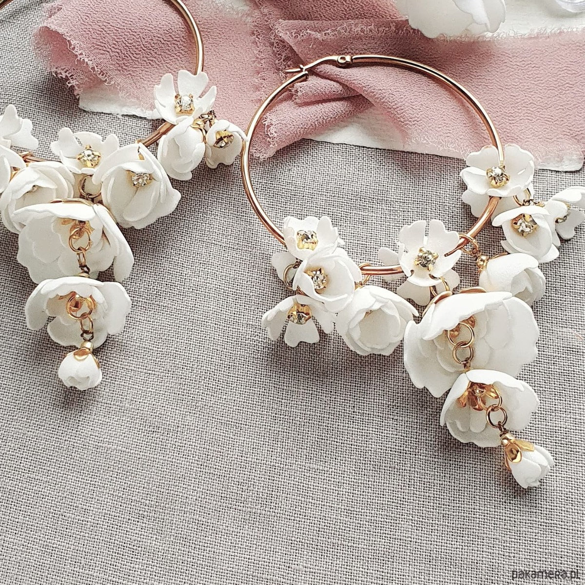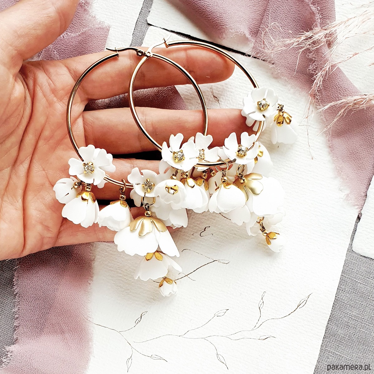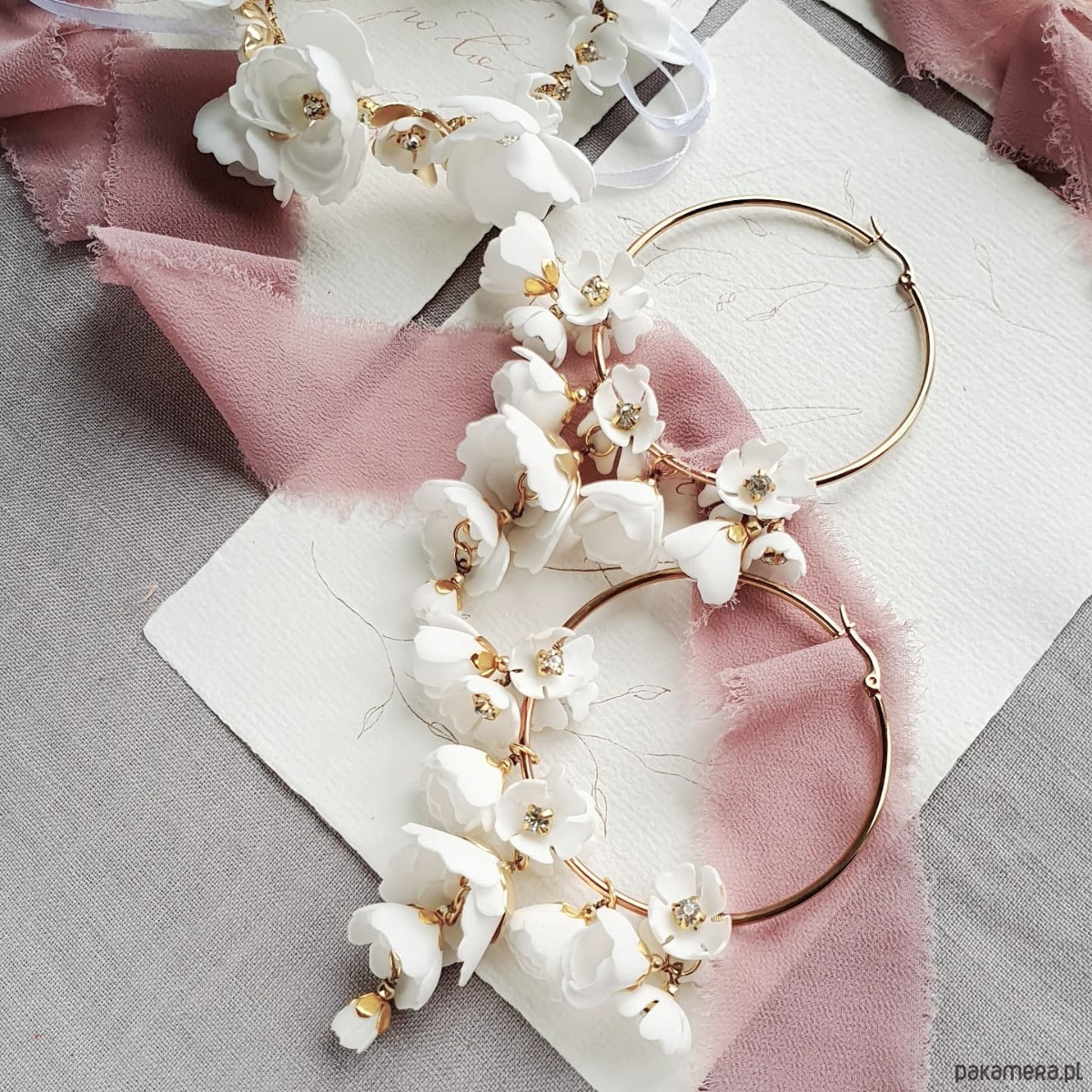 Elementy kwiatowe zostały zamocowane na dużych kołach (średnica koła to 6 cm, ale można zamówić wersję na kole 5 cm) . Kaskady wykonane z ręcznie formowanych kwiatów oraz kamieni Preciosa, pięknie prezentują się zarówno do stylizacji boho chic, jak i do gładkich, nowoczesnych sukien ślubnych.