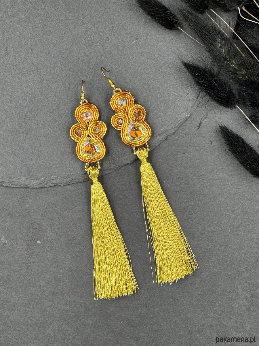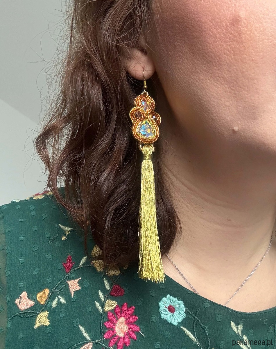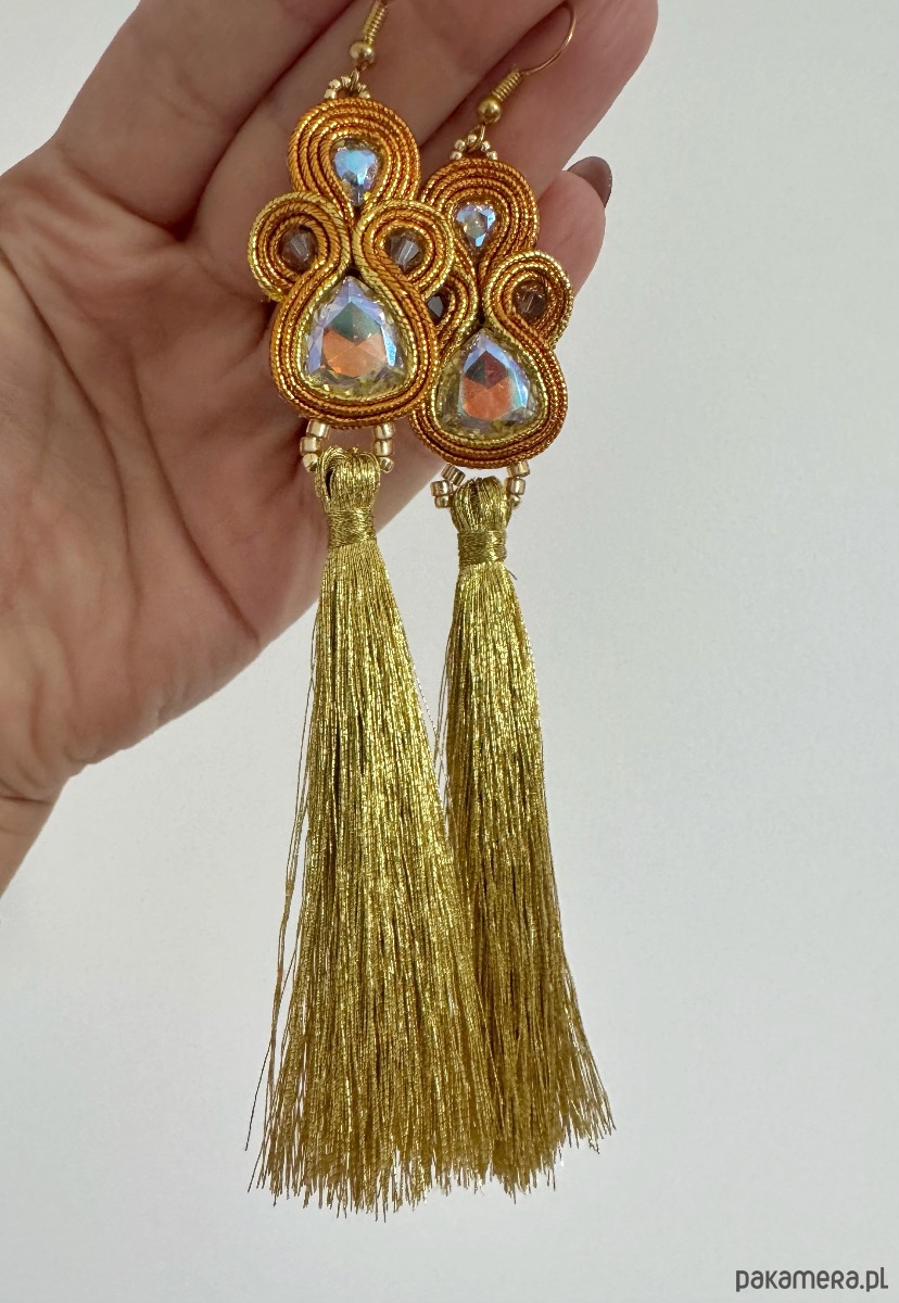 Te zachwycające kolczyki sutasz w odcieniu złota zostały wykonane z dbałością o każdy detal. Eleganckie chwosty dodają im lekkości, a kryształowe zdobienia pięknie odbijają światło, podkreślając Twój blask.