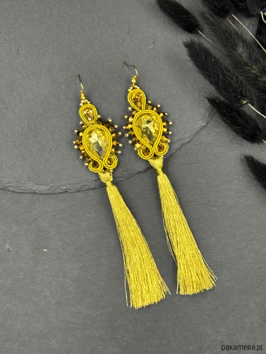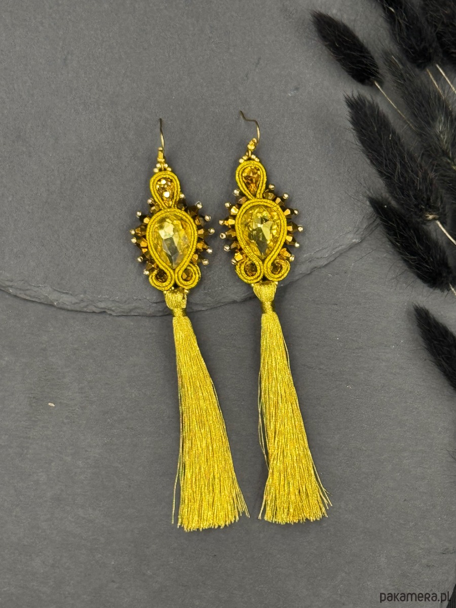 Ręcznie wykonane, efektowne kolczyki w technice sutasz, ozdobione złotymi kryształami oraz długimi złotymi chwostami.