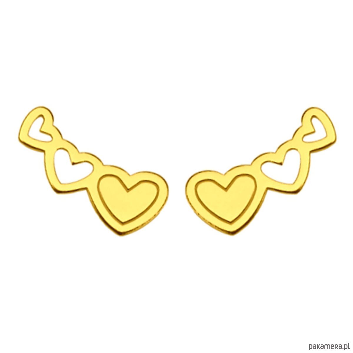 Złote kolczyki w kształcie potrójnych serduszek. Zapinane na sztyft. Para ma lewy i prawy kolczyk. Kolczyki posiadają zapięcia (baranki). Kolczyki w całości wykonane są ze srebra 925 powlekanego 24 karatowym żółtym złotem.