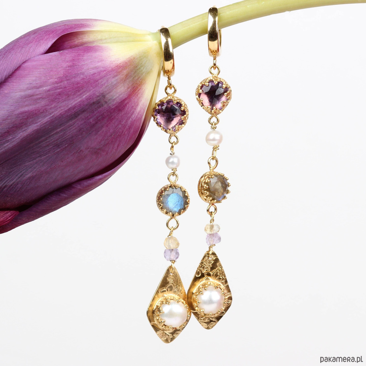 Ręcznie wykonane kolczyki ze srebra pokrytego 24 karatowym złotem z ametystem, labradorytem, cytrynem i perłą z kwiecistymi grawerunkami na dolnej części inspirowane francuskim muzeum sztuki nowoczesnej – Centre Pompidou