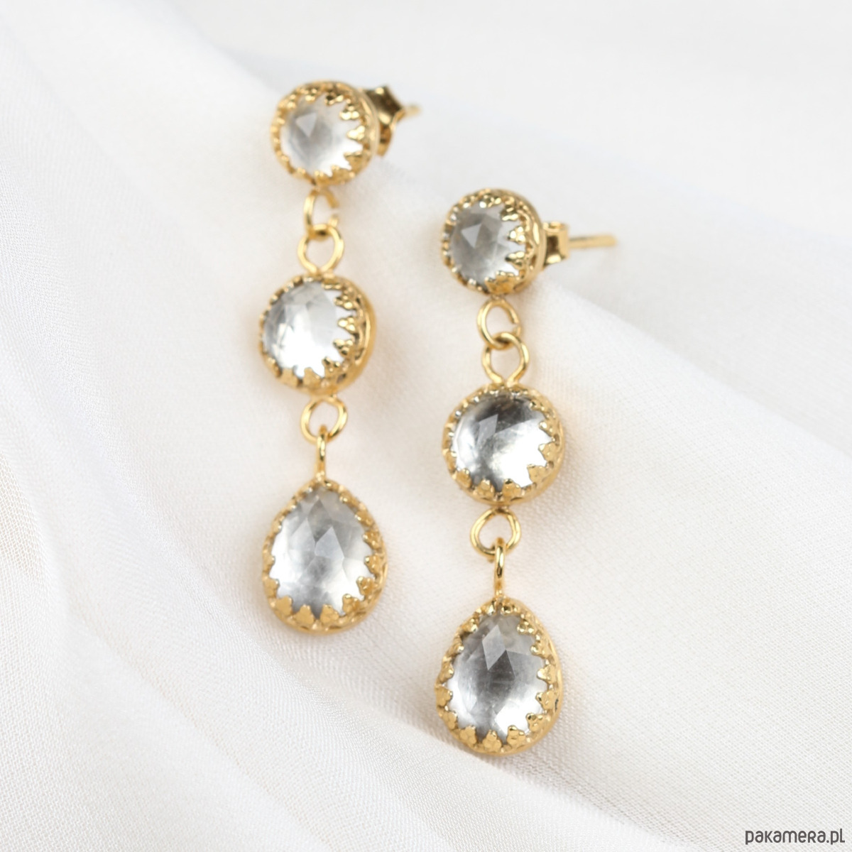 Ręcznie wykonane kolczyki ze srebra pokrytego 24 karatowym złotem z kryształem górskim z pięknym wykończeniem retro wokół kamienia. Tył kolczyków ozdobiony kwiatami urodzinowymi aby dodać im jeszcze bardziej unikatowego charakteru (każdy egzemplarz jest zdobiony w inny sposób:)