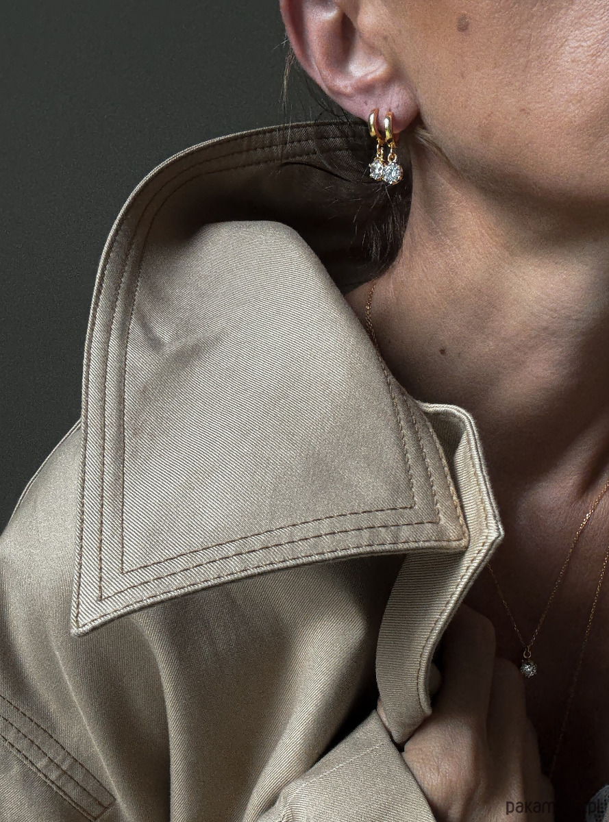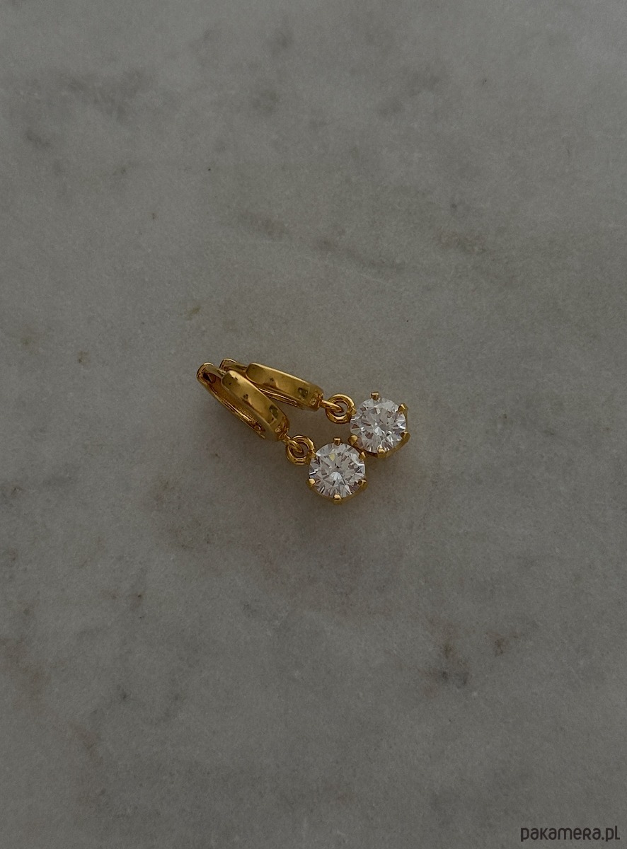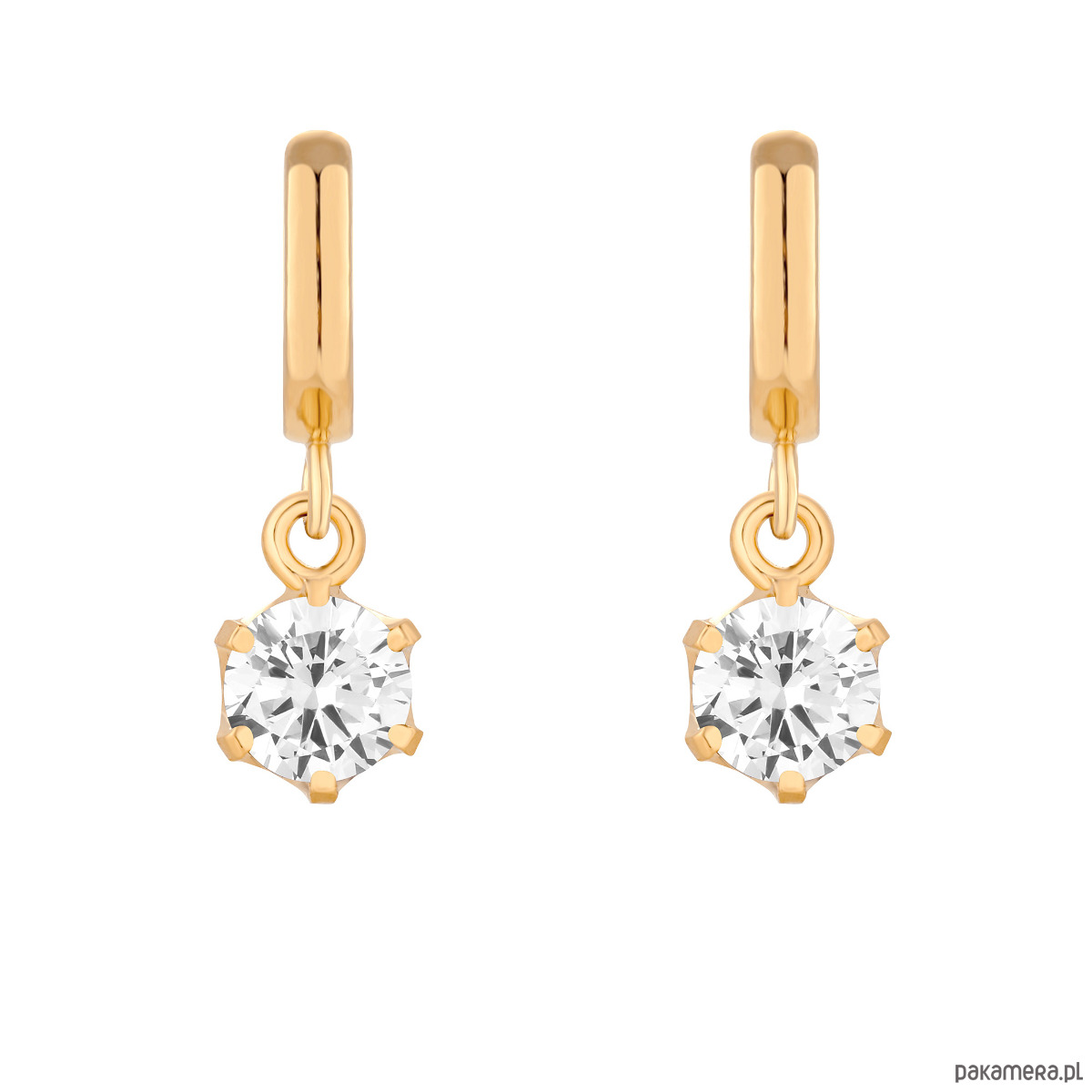 Złote kolczyki z bezbarwnymi cyrkoniami. Całość wykonana ze srebra 925 powlekanego 24 karatowym żółtym złotem.