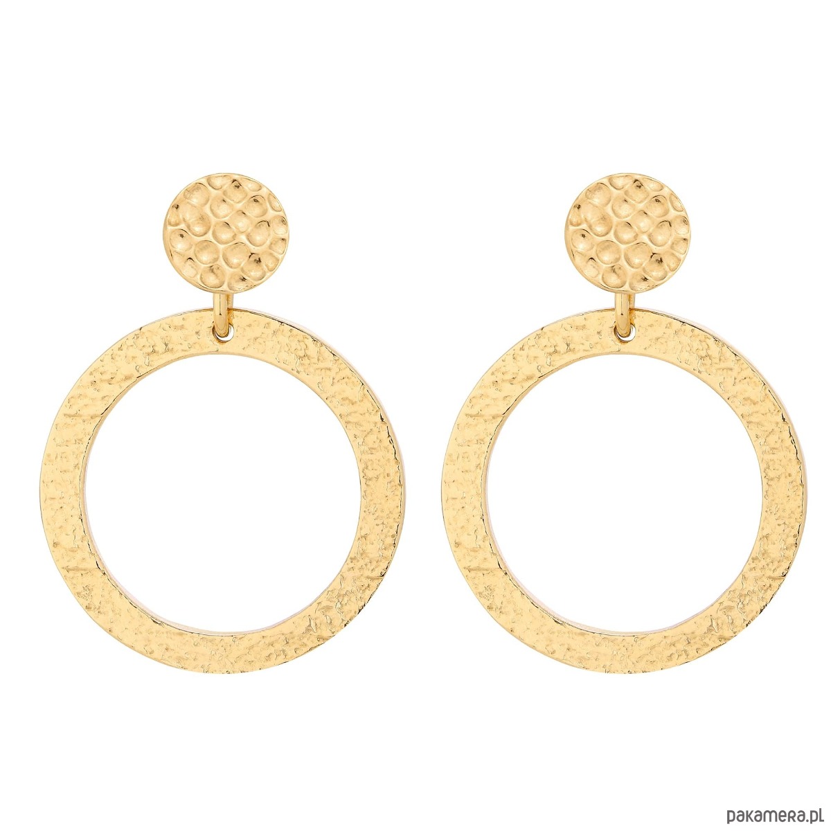 Złote długie kolczyki z chropowatymi obręczami. Zapinane na sztyft. Kolczyki posiadają zapięcia (baranki). Całość wykonana ze srebra 925 powlekanego 24 karatowym żółtym złotem.