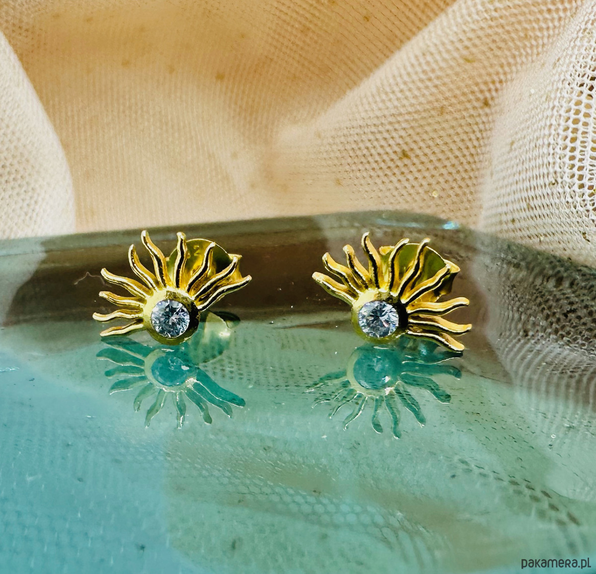 Złote kolczyki z cyrkonią , eleganckie sztyfty, słoneczne kolczyki