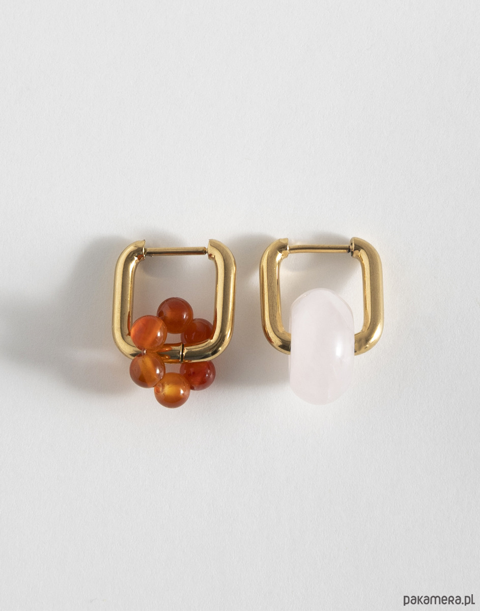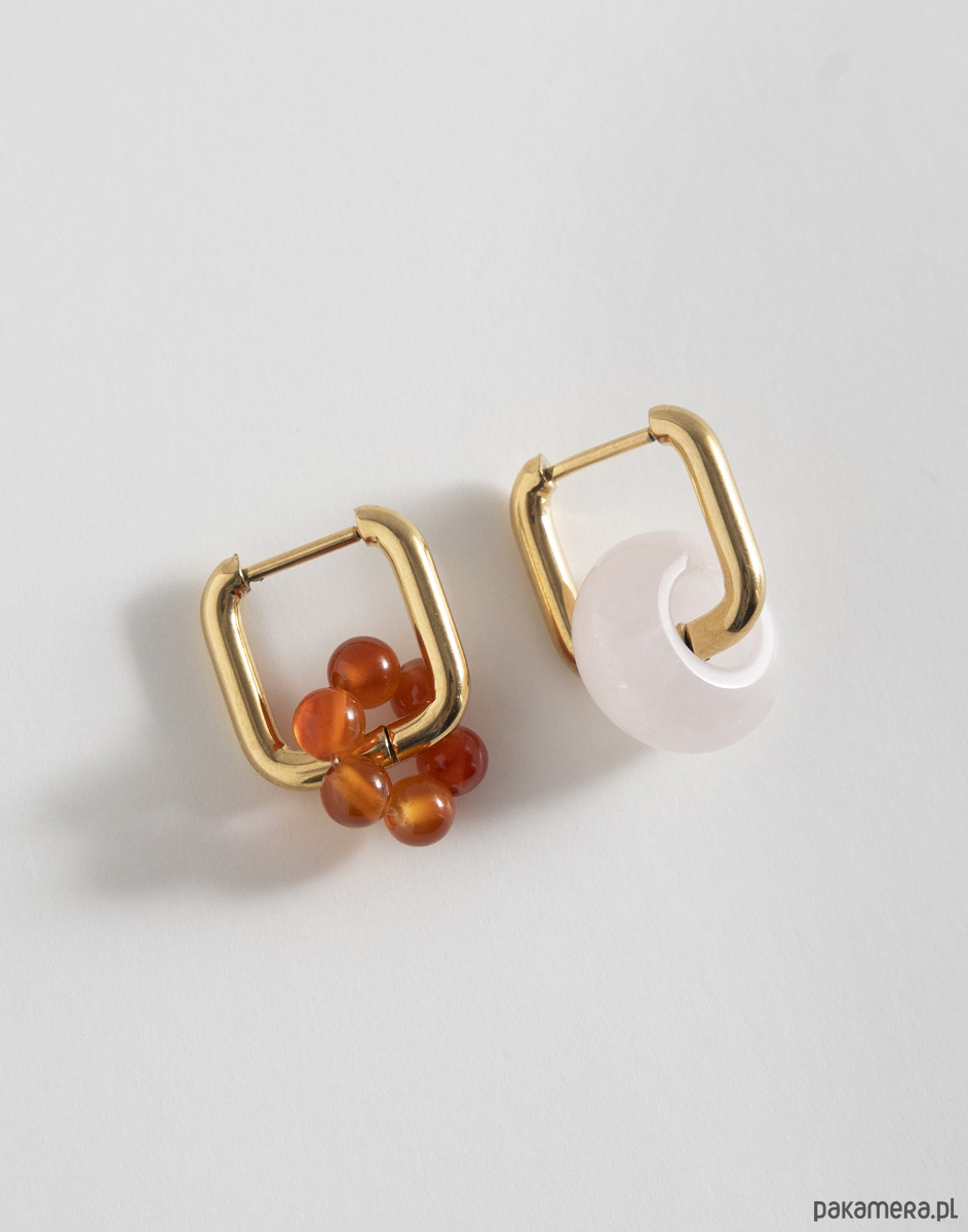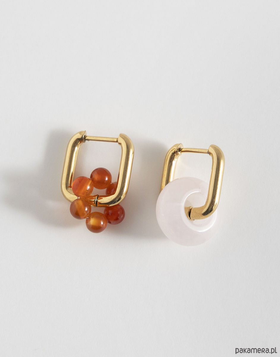 Kolczyki wykonano ze złotej stali chirurgicznej, a zawieszki — w kształcie oponki z jadeitu oraz kwiatka z agatu.