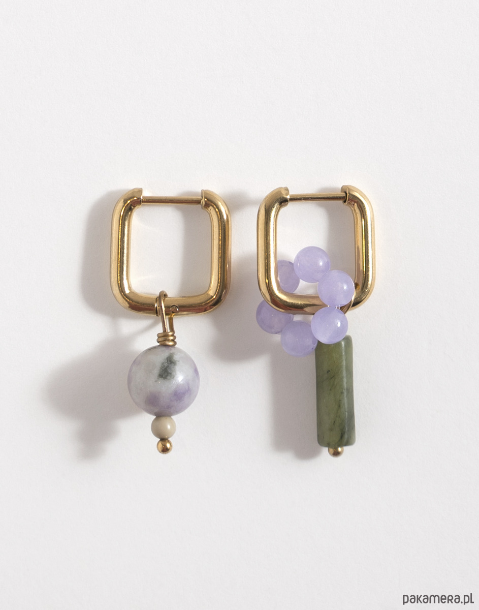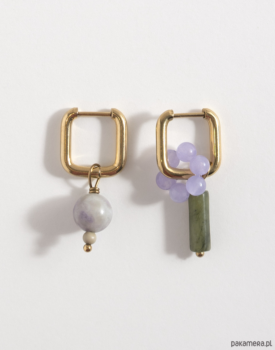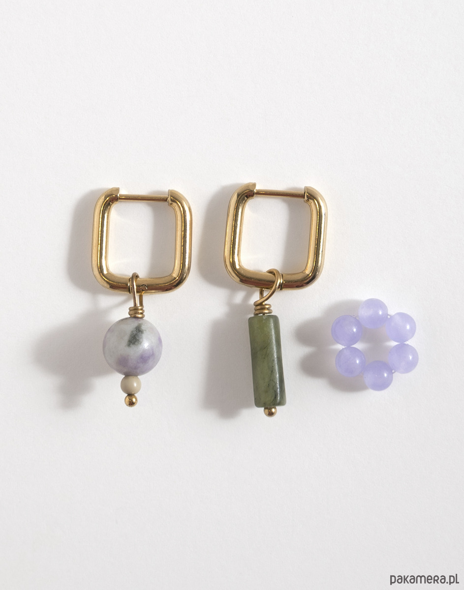 Kolczyki wykonano ze stali chirurgicznej. Zestaw zawiera trzy wymienne zawieszki: kwiatek z jadeitu oraz zawieszki z jadeitu i serpentynitu. Zawieszki można nosić razem, pojedynczo lub całkowicie je odpiąć, pozostawiając same kolczyki. Świetnie sprawdzą się też jako element naszyjnika – można je dowolnie komponować w zależności od stylizacji.