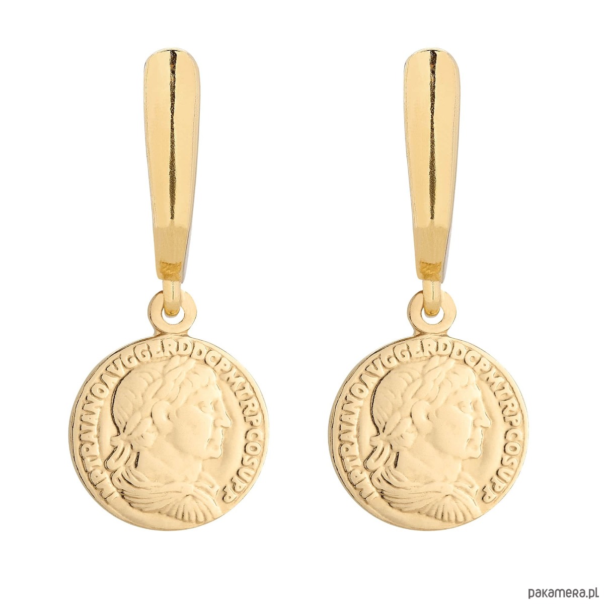 Złote kolczyki z monetami. Zapinane na bigle angielskie. Całość wykonana ze srebra 925 powlekanego 24 karatowym żółtym złotem.