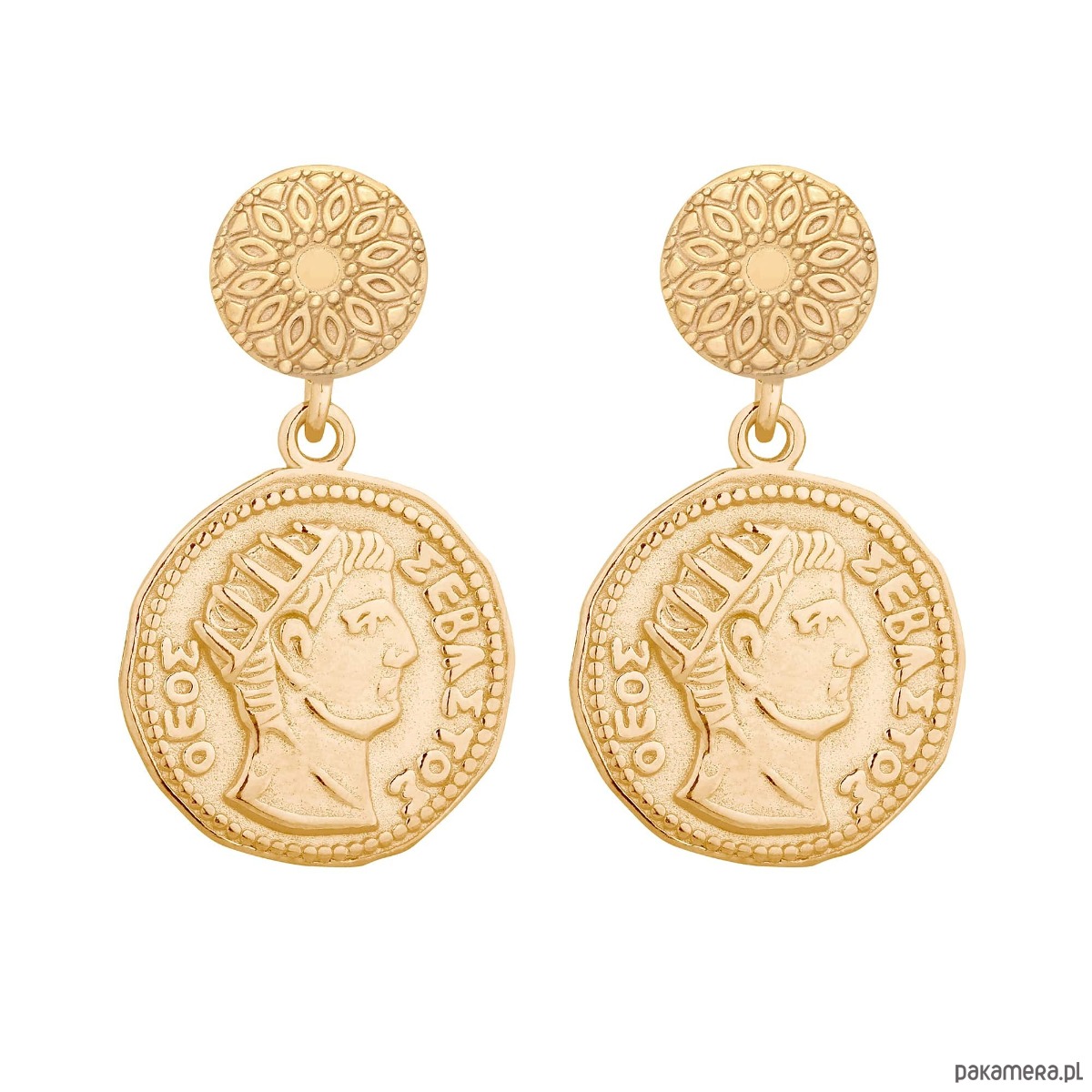 Złote kolczyki z monetami. Zapinane na sztyfty. Całość wykonana ze srebra 925 powlekanego 24 karatowym żółtym złotem.