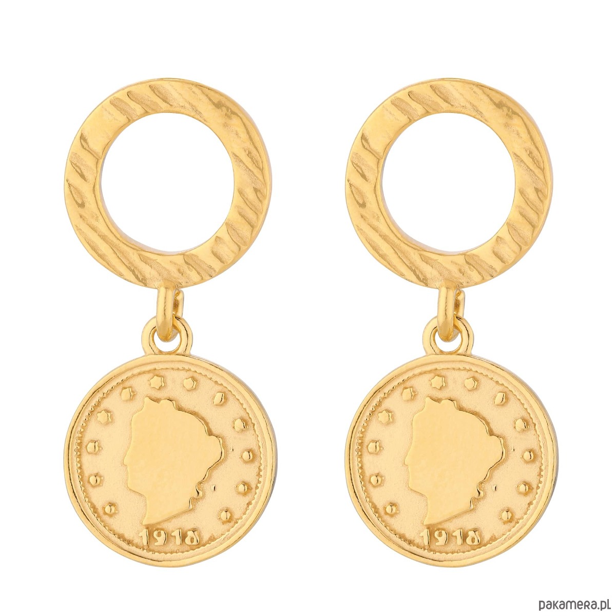 Złote kolczyki z chropowatym kółeczkiem i monetą. Zapinane na sztyft. Kolczyki posiadają zapięcia (baranki). Całość wykonana ze srebra 925 powlekanego 24 karatowym żółtym złotem.