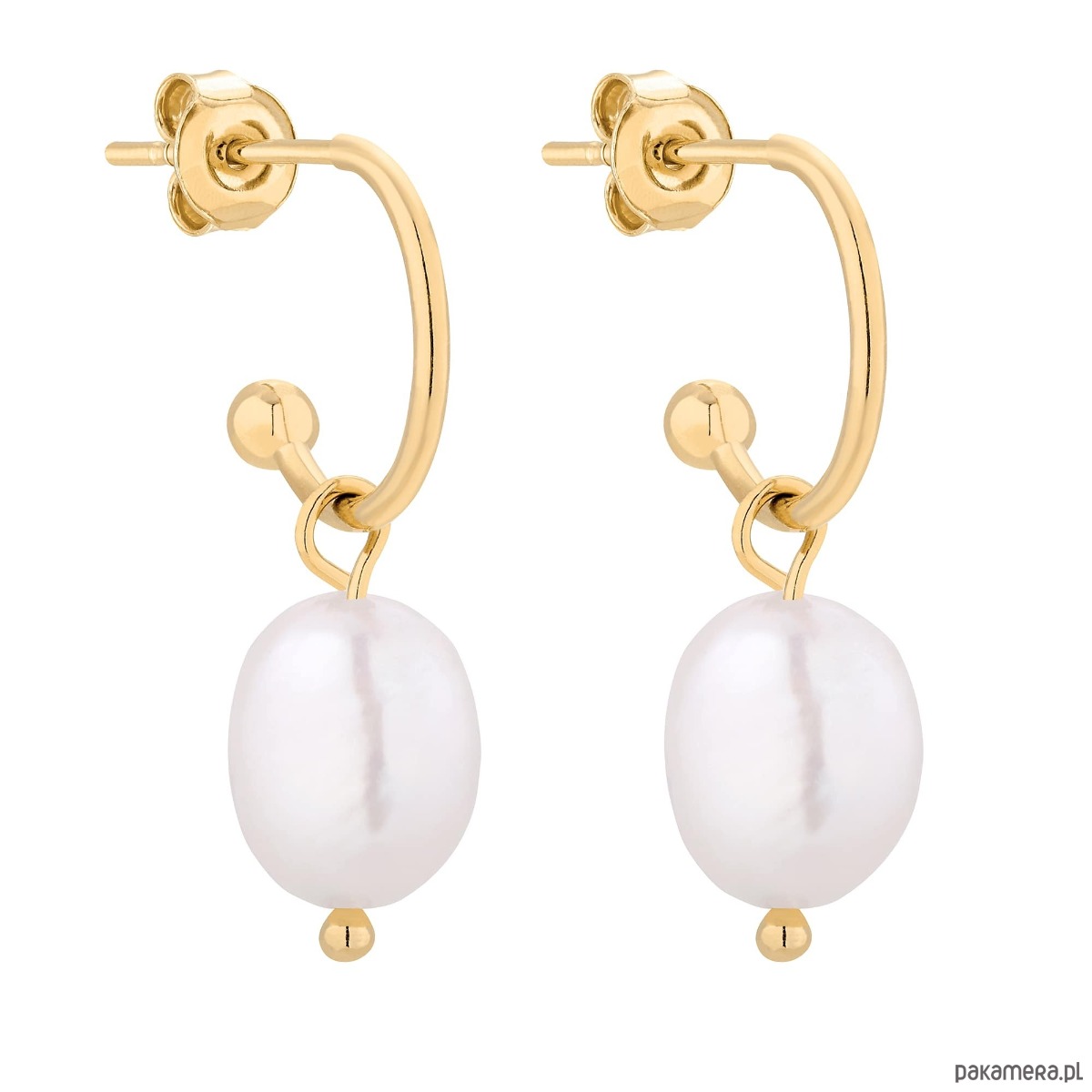 Złote kolczyki z naturalnymi nieregularnymi perłami. Całość wykonana ze srebra 925 powlekanego 24 karatowym żółtym złotem. Zapinane na sztyft. Kolczyki posiadają zapięcia (baranki).
