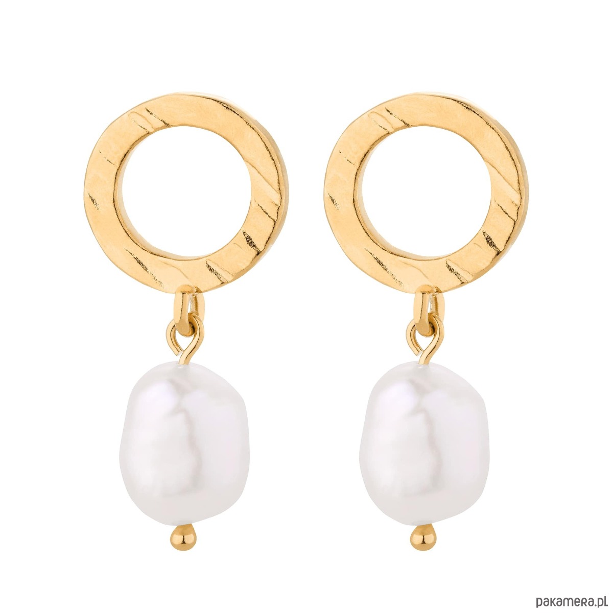 Złote kolczyki z chropowatymi kółeczkami i naturalnymi nieregularnymi perłami. Całość wykonana ze srebra 925 powlekanego 24 karatowym żółtym złotem. Zapinane na sztyft. Kolczyki posiadają zapięcia (baranki).