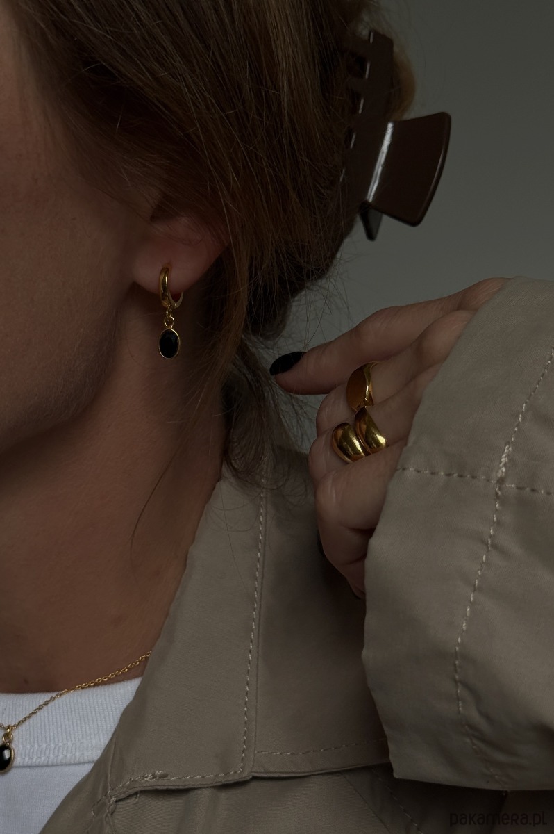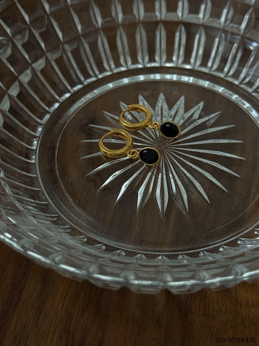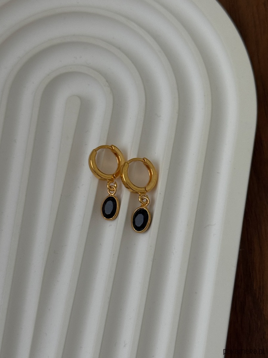 Złote kolczyki z czarnymi onyksami. Całość wykonana ze srebra 925 powlekanego 24 karatowym żółtym złotem.