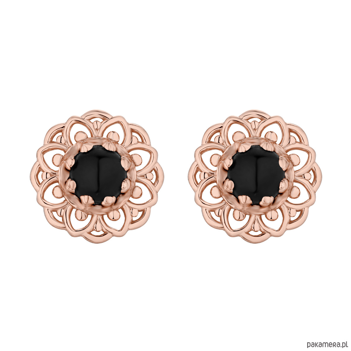 Złote kolczyki rozety z czarnymi onyksami. Całość wykonana ze srebra 925 powlekanego 18 karatowym różowym złotem. Kolczyki posiadają zapięcia (baranki).