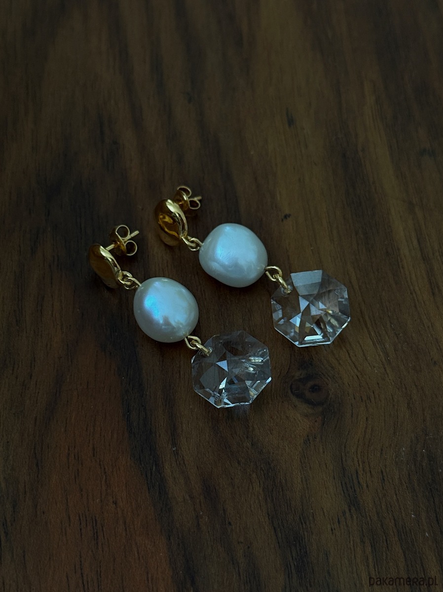 Złote kolczyki z perłami i bezbarwnymi kryształami Octagon SWAROVSKI® CRYSTAL. Całość wykonana ze srebra 925 powlekanego 24 karatowym żółtym złotem. Zapinane na sztyft. Kolczyki posiadają zapięcia (baranki).