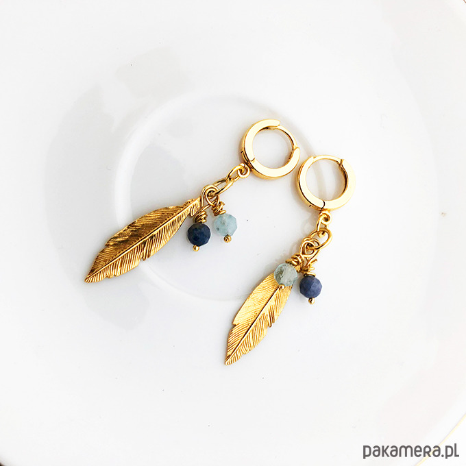 Piękne, efektowne kolczyki w stylu boho z wyjątkowymi zawieszkami w kształcie piór, połączone ze ślicznymi, naturalnymi kamieniami. Pióra harmonijnie współgrają z zapięciem w kształcie kół, tworząc lekki i artystyczny design.