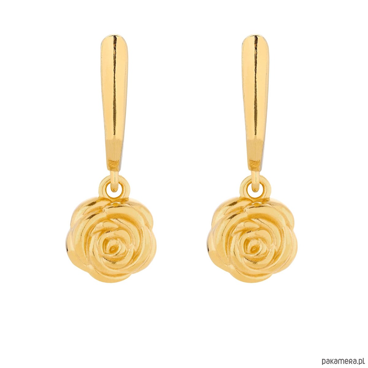 Złote kolczyki z różami. Zapinane na bigle angielskie. Całość wykonana ze srebra 925 powlekanego 24 karatowym żółtym złotem.