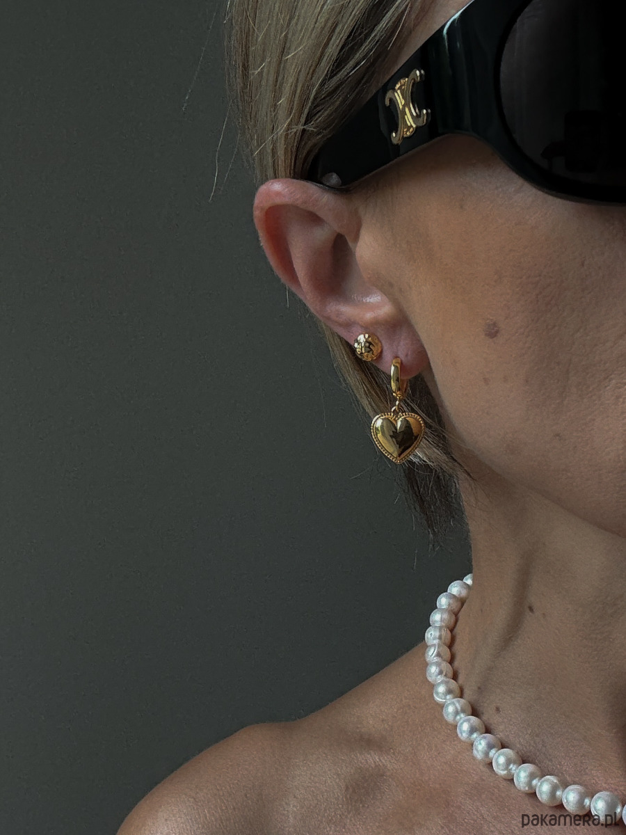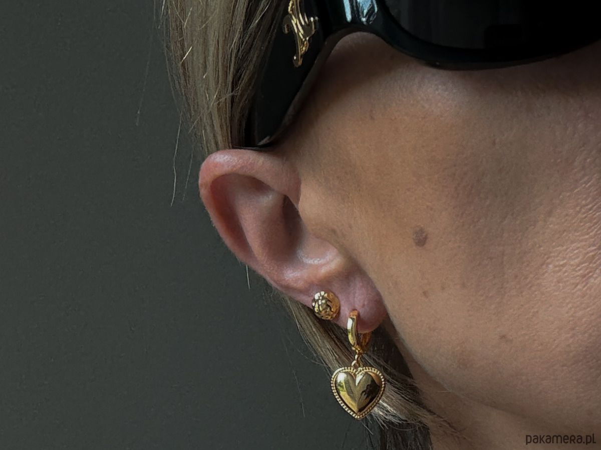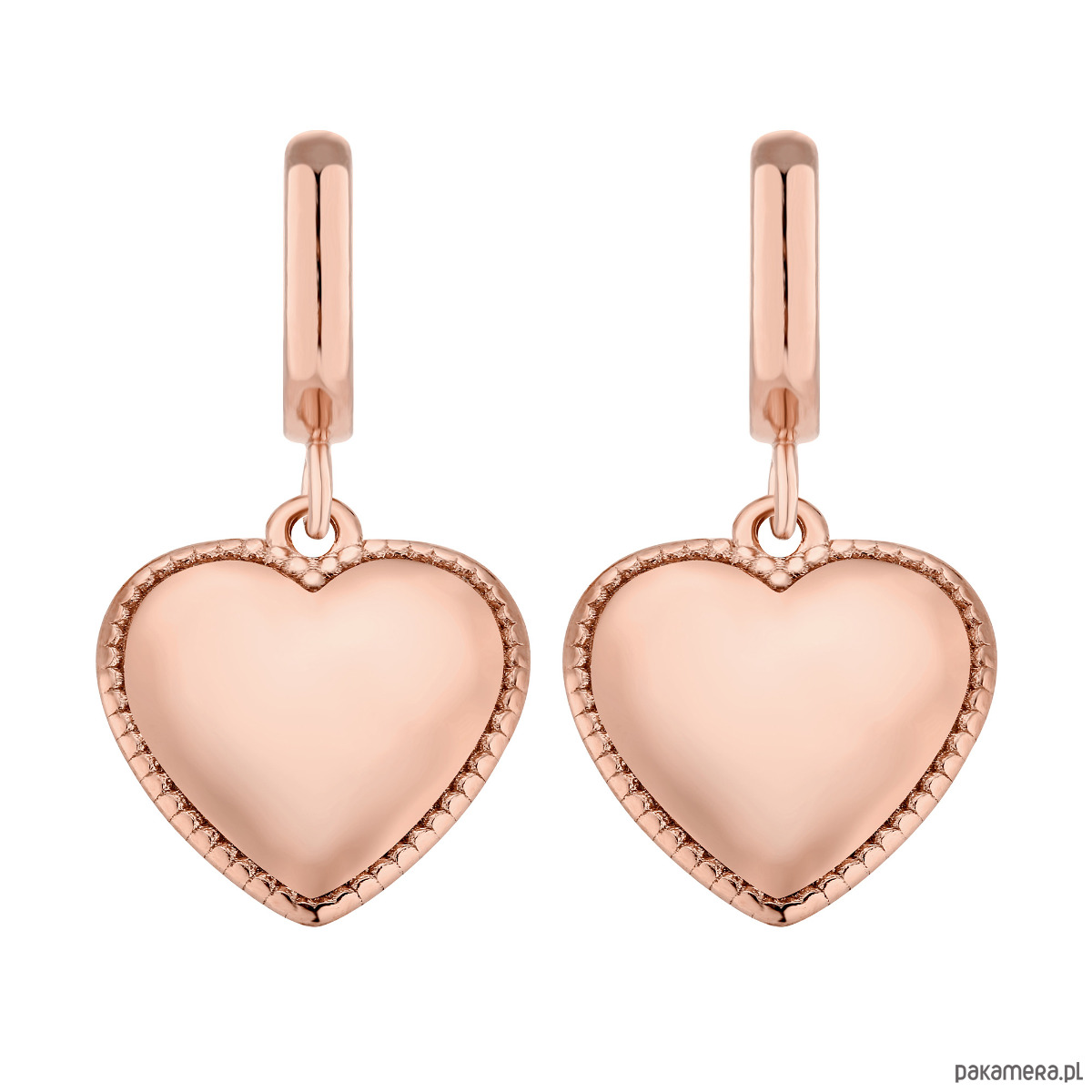 Złote kolczyki serca otoczone kuleczkami. Serduszka zawieszone są na zamykanych biglach. Całość wykonana ze srebra 925 powlekanego 18 karatowym różowym złotem.