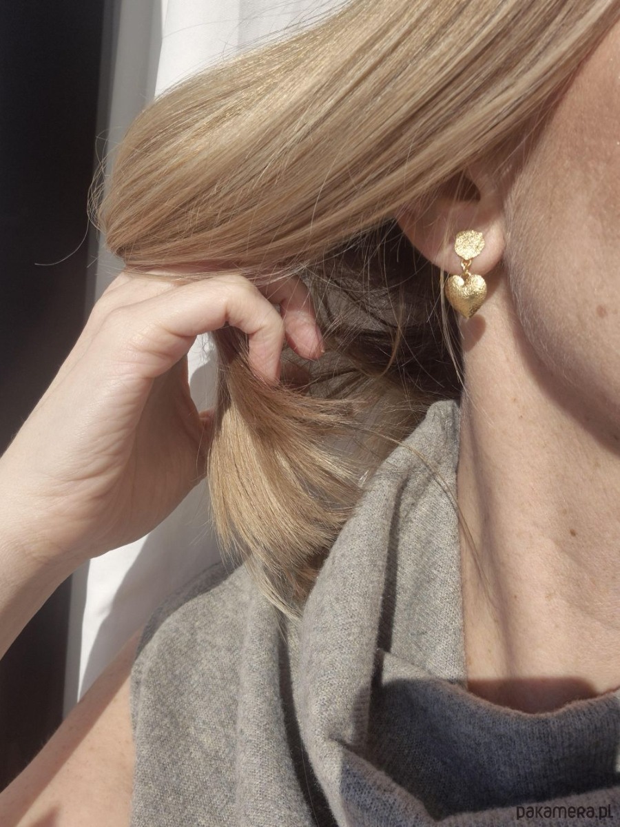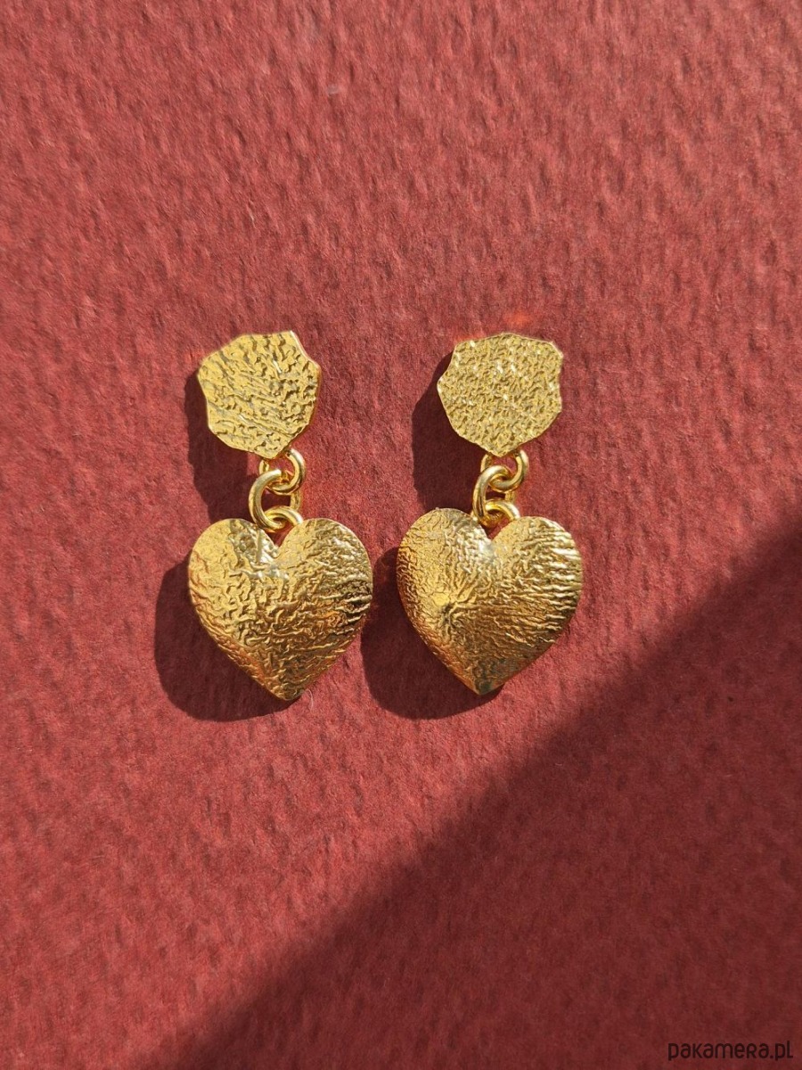 Kolczyki z serduszkami. W stylu lat 80-tych. Bogato zdobione, zarówno bigle, jak i serduszka wykonane ze szczotkowanego pozłacanego srebra 925. Uniwersalne, pasują do mniej lub bardziej szalonych stylizacji. To świetny pomysł na prezent dla kogoś bliskiego lub dla siebie.