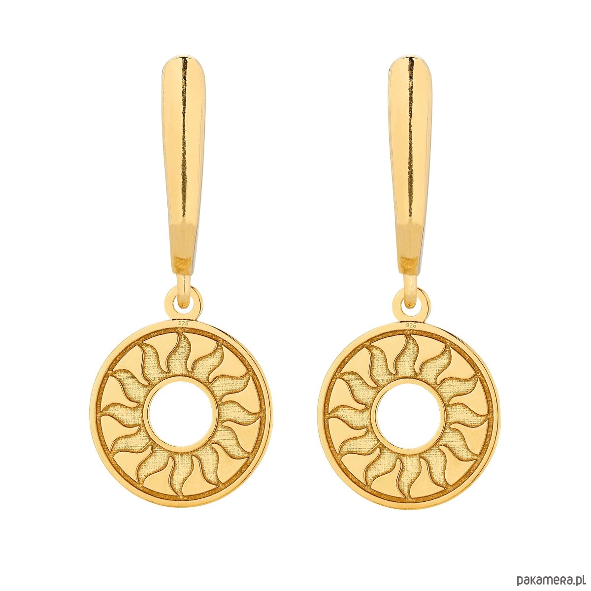 Złote kolczyki ze słoneczkami. Zapinane na bigle angielskie. Całość wykonana ze srebra 925 powlekanego 24 karatowym żółtym złotem.