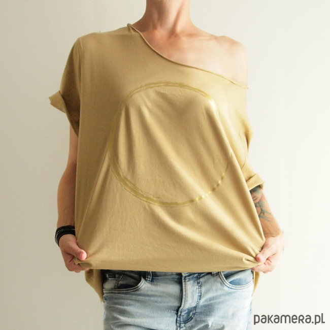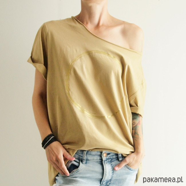 Złote koło na ciemnopiaskowej koszulce. Śliczna gra świateł na matowym nadruku.