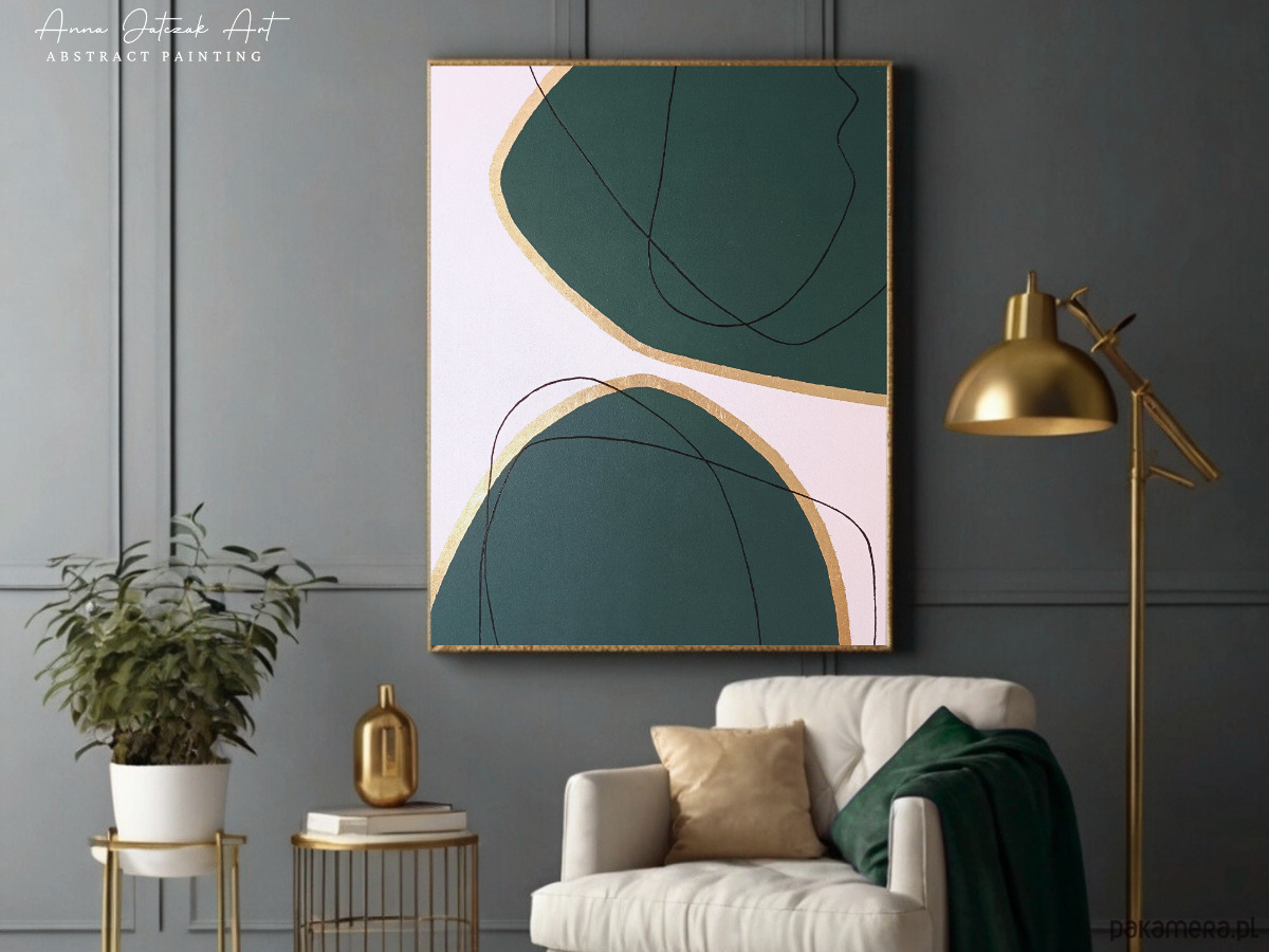 „Złote Kontury Harmonii” to ręcznie malowany obraz abstrakcyjny o wymiarach 70 x 100 cm, w którym czyste białe tło stanowi przestrzeń dla dwóch organicznych kształtów w głębokiej zieleni. Ich kontury podkreślone są złotą linią, która subtelnie mieni się w świetle, nadając całości elegancji i nowoczesnego charakteru. Całość dopełniają czarne, dynamiczne linie, które wprowadzają lekkość i swobodę, tworząc wyważoną, harmonijną kompozycję.