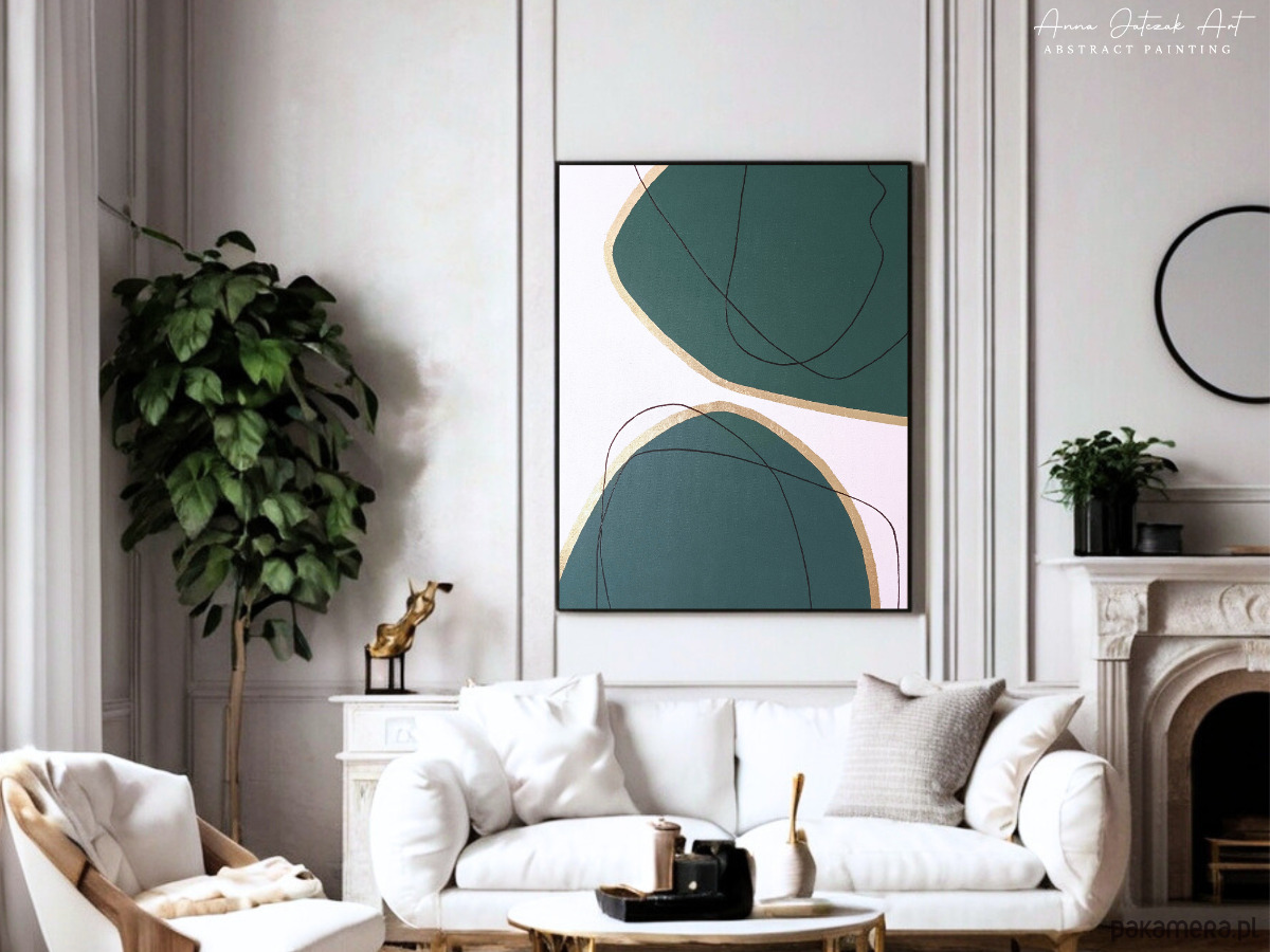 „Złote Kontury Harmonii” to ręcznie malowany obraz abstrakcyjny o wymiarach 70 x 100 cm, w którym czyste białe tło stanowi przestrzeń dla dwóch organicznych kształtów w głębokiej zieleni. Ich kontury podkreślone są złotą linią, która subtelnie mieni się w świetle, nadając całości elegancji i nowoczesnego charakteru. Całość dopełniają czarne, dynamiczne linie, które wprowadzają lekkość i swobodę, tworząc wyważoną, harmonijną kompozycję.