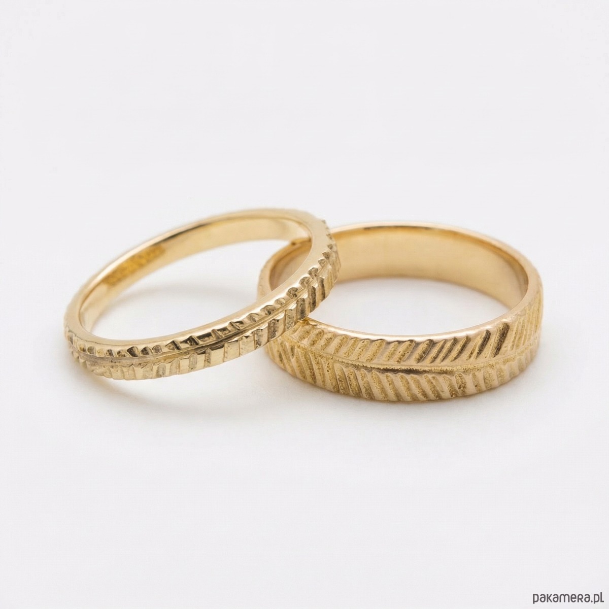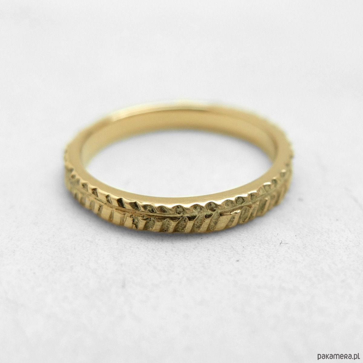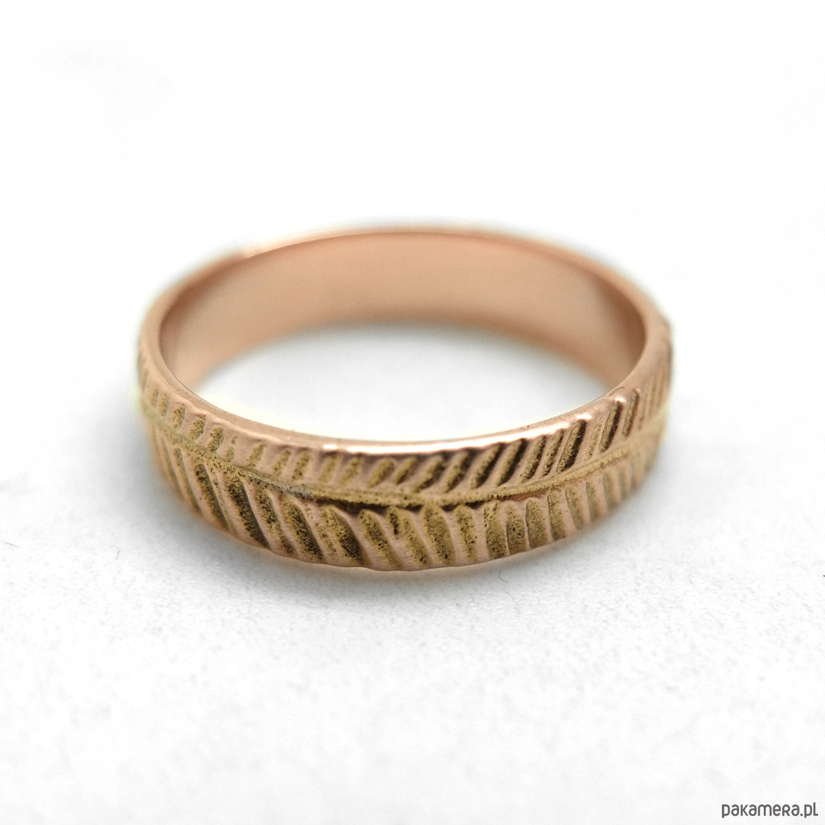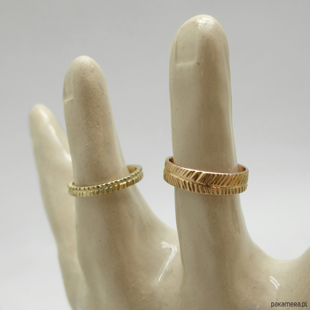 Złote obrączki ślubne Fern wykonane są z 14 karatowego złota. Inspirowane są kształtem liści paproci. Na przykładowych zdjęciach jedna jest zrobiona z żółtego złota a druga z różowego. Przy zamówieniu wskaż preferowany kolor złota dla swoich obrączek.