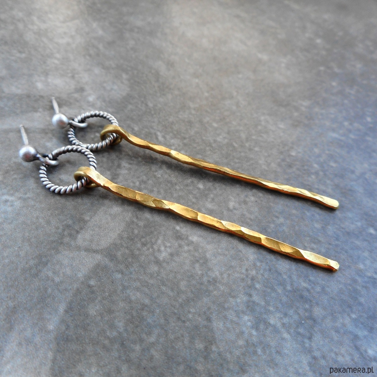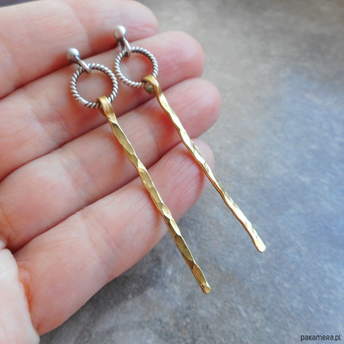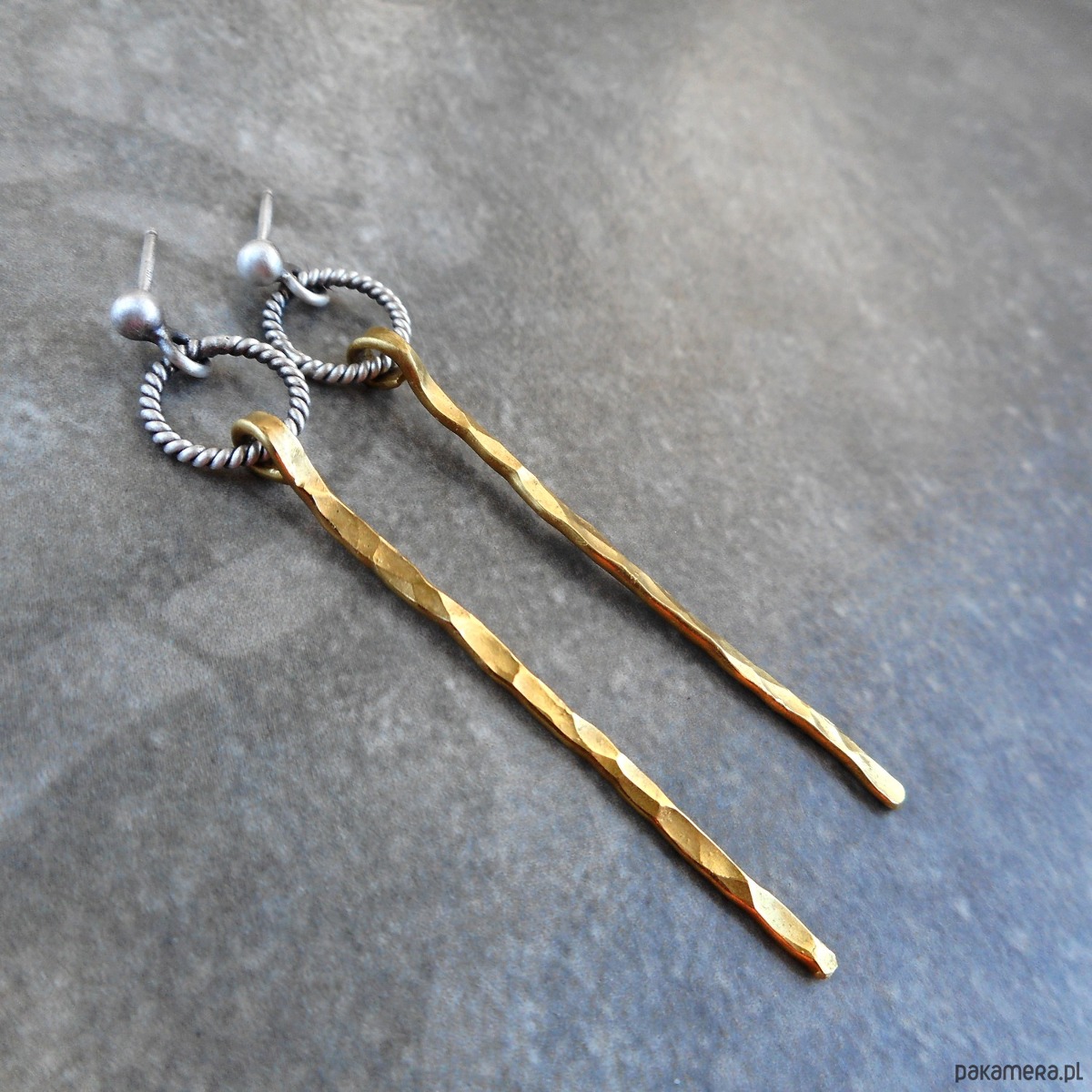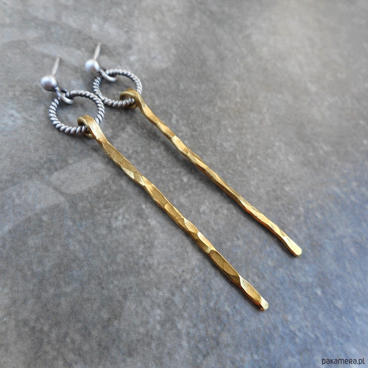 Stylowe kolczyki wykonane ze szlachetnego srebra i mosiądzu; nowoczesne, nie obciążające ucha, w formie kółeczek ze smukłymi, zawieszkami.