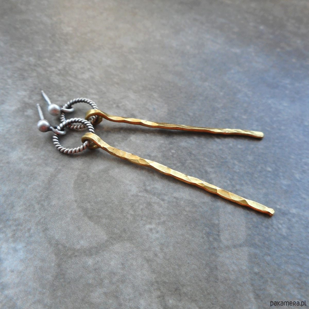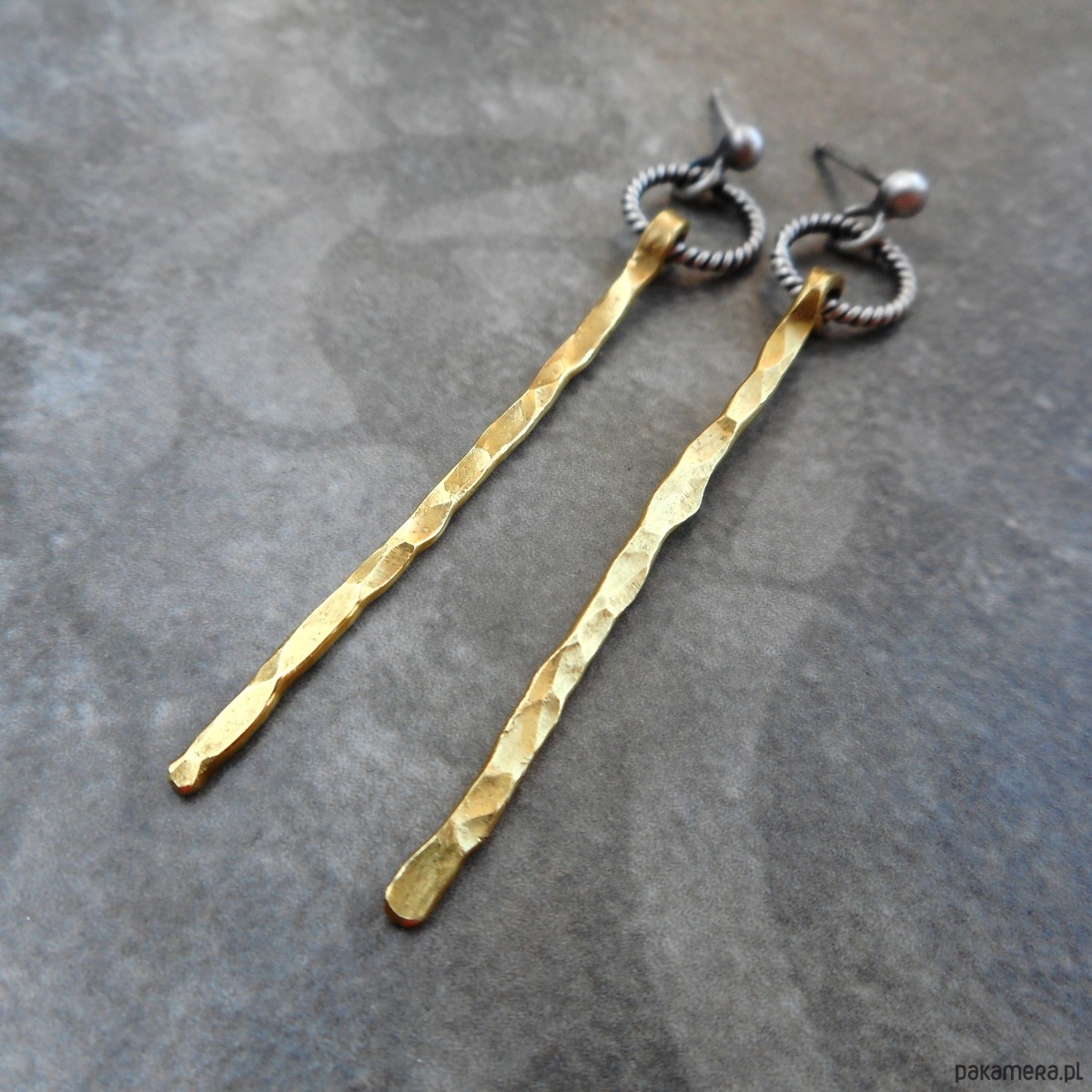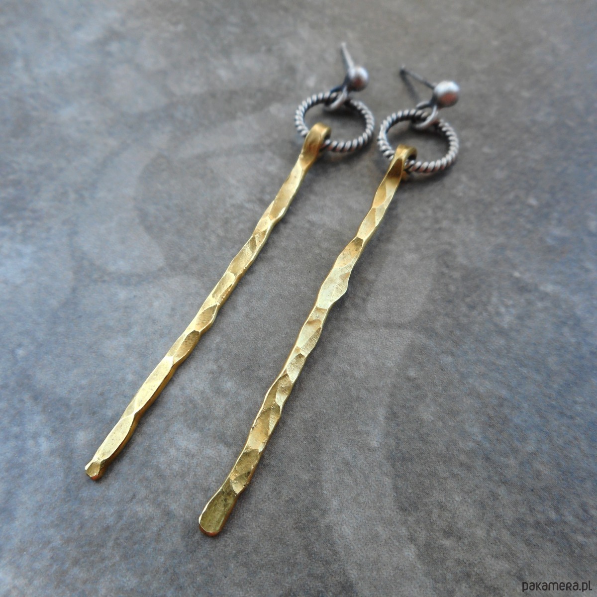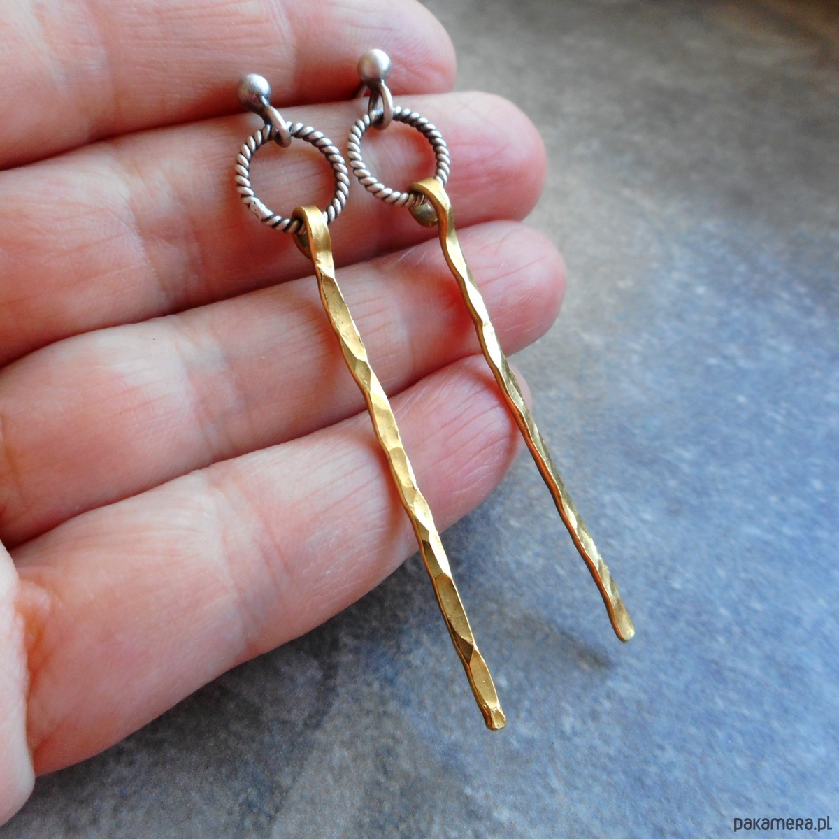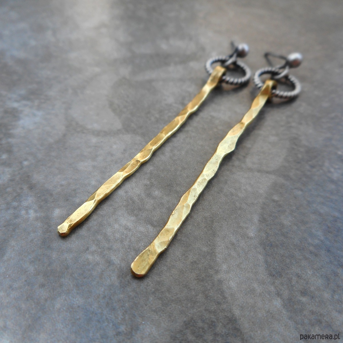 Stylowe kolczyki wykonane ze szlachetnego srebra i mosiądzu; nowoczesne, nie obciążające ucha, w formie kółeczek ze smukłymi, zawieszkami.