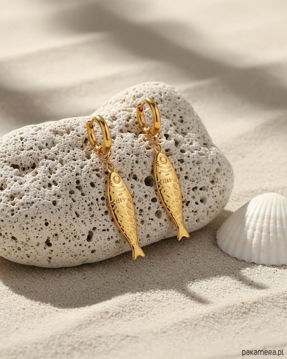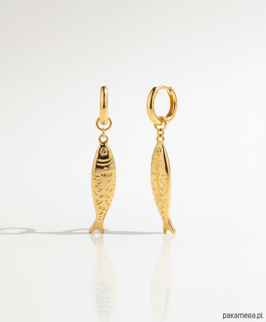 Złote wiszące kolczyki 2w1 z rybką ze stali chirurgicznej premium Sardis