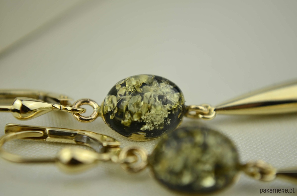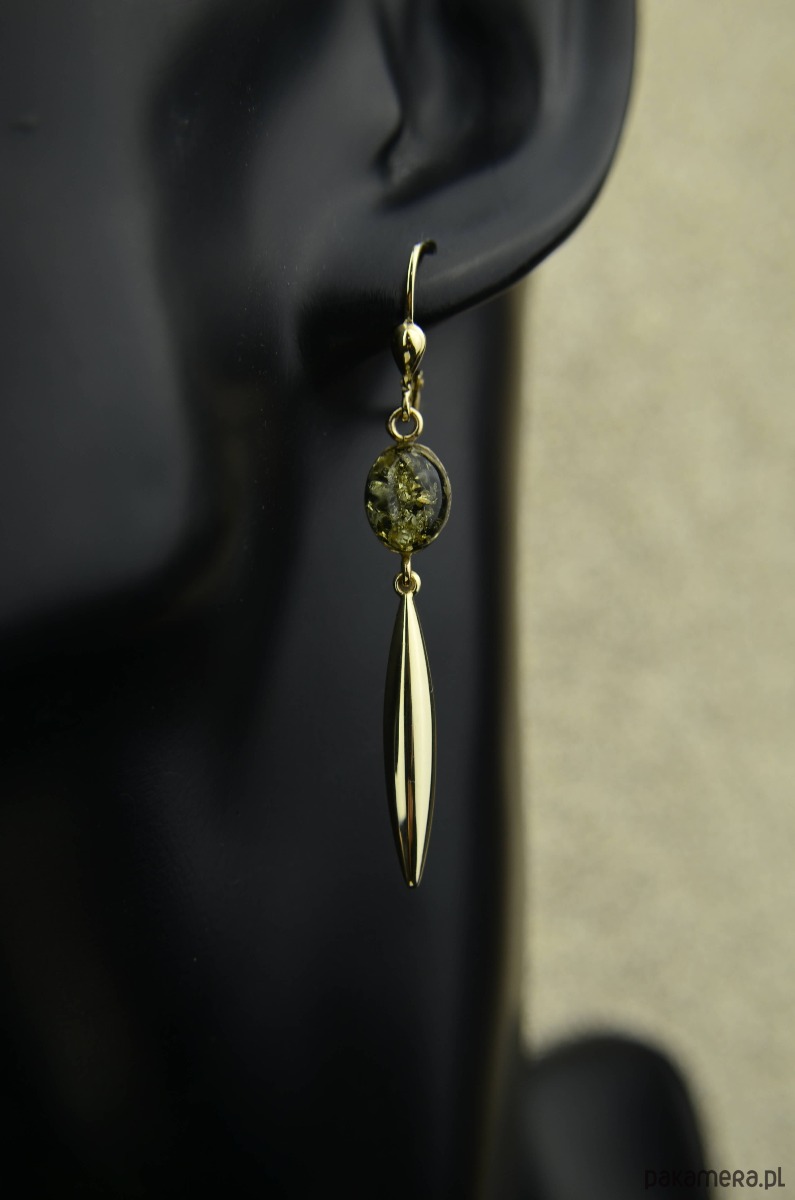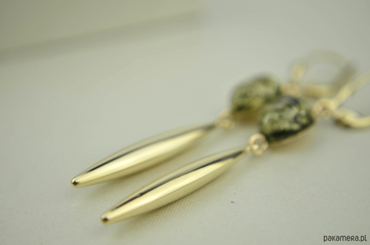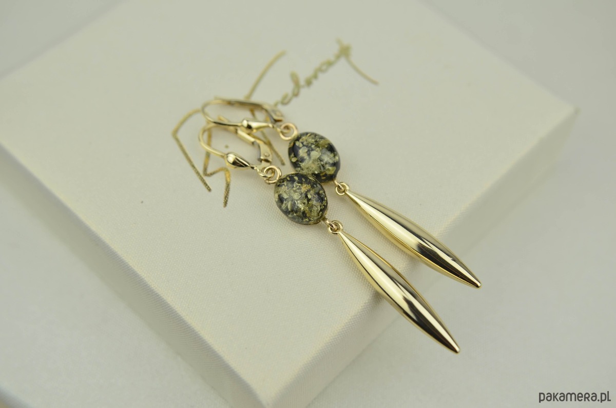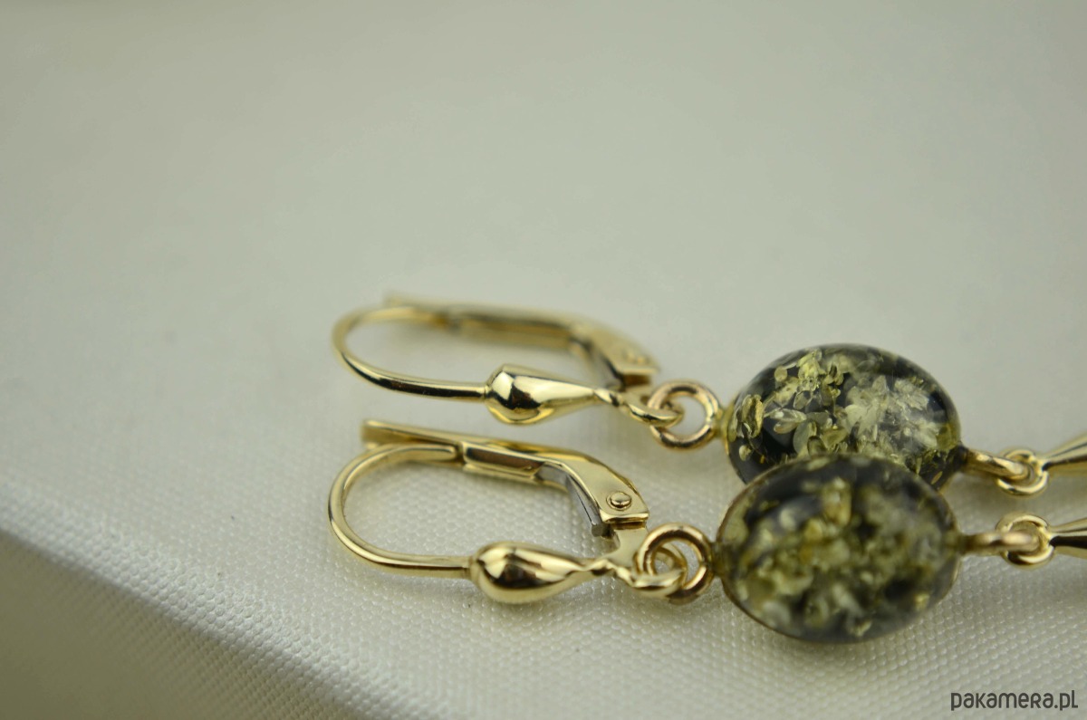 Złote wiszące kolczyki z zielonym bursztynem pr. 585