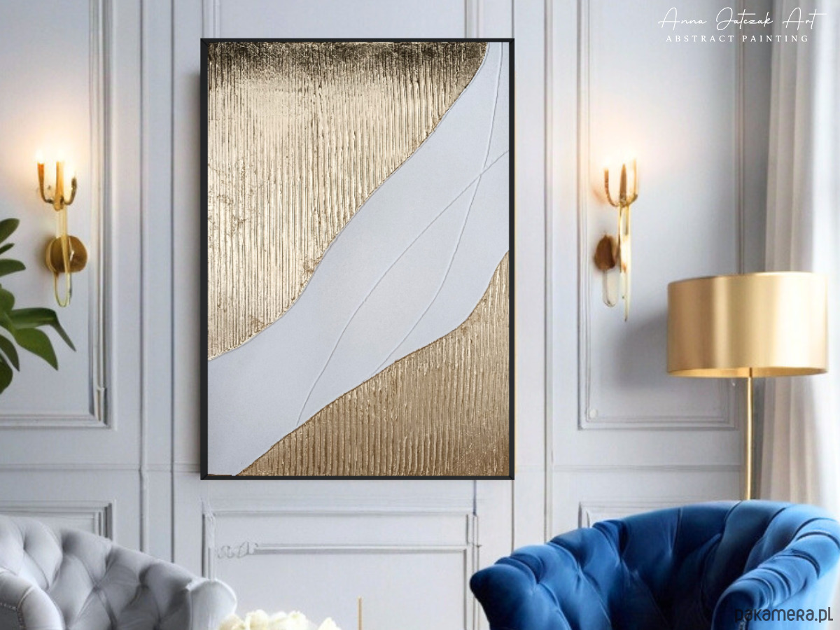 Oryginalne, ręcznie malowane, teksturowane dzieło sztuki, które emanuje elegancją i wyrafinowaniem. Ten abstrakcyjny obraz charakteryzuje się luksusową mieszanką miękkiego kremu i promiennego złota, z misternymi teksturami, które pięknie łapią światło. Podniesione detale tworzą głębię i wymiar, dzięki czemu dzieło to jest uderzającym punktem centralnym w każdej przestrzeni.